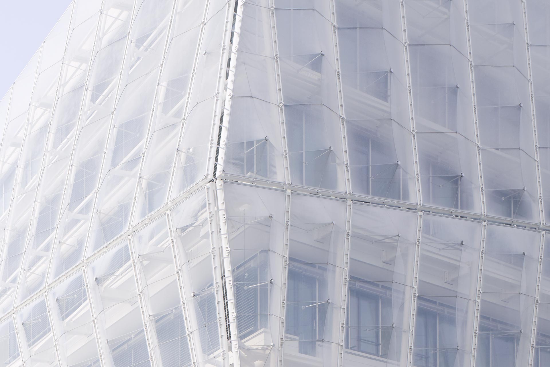 While implementing technologies that help save resources, the energy concept adheres to the principle of avoiding technical solutions wherever possible. The office area is cooled by means of thermally activated reinforced concrete ceilings. A single-layer film facade placed in front of the building’s insulation glazing protects the daylight-optimized blinds from strong wind and other weather influences. The use of an ETFE film significantly reduced the energy expenditure for the production - compared to a glass façade.