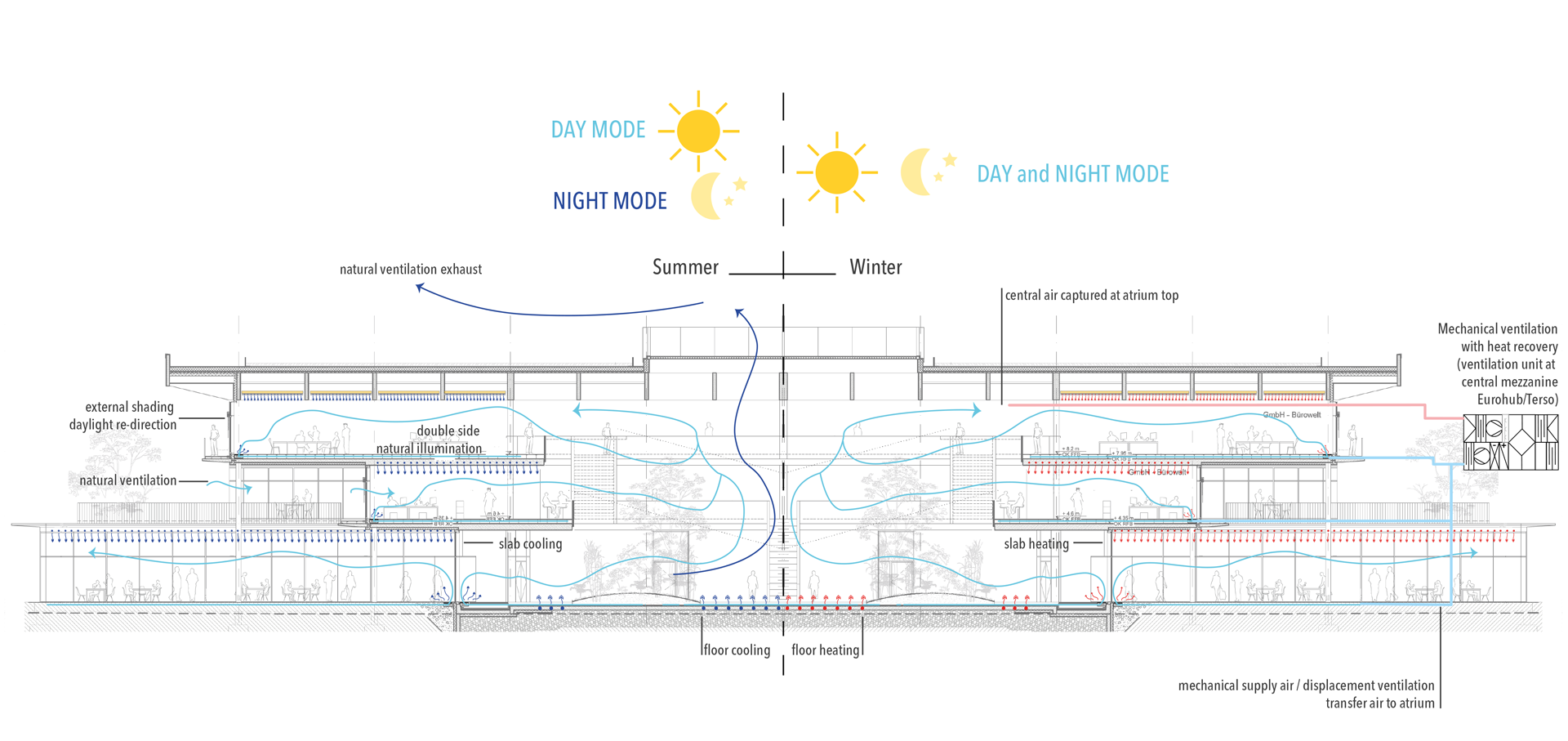 La ventilation mécanique contribue au maintien du confort thermique des occupants ainsi que la qualité désirée de l'air intérieur. Dans les espaces de travail, un concept de ventilation par déplacement est introduit. L'air est fourni au niveau du plancher à basse vitesse et est collecté de manière centralisée au niveau de l'atrium, il est ensuite acheminé vers la centrale de traitement de l'air pour la récupération de la chaleur. La facade a été conçue de manière à maximiser l'accès à la lumière naturelle des lieux de travail, tout en s'affranchissant des gains solaires en été, et ce en régulant passivement et activement l’irradiation solaire pénétrante dans la pièce par le biais de stores vénitiens extérieurs.