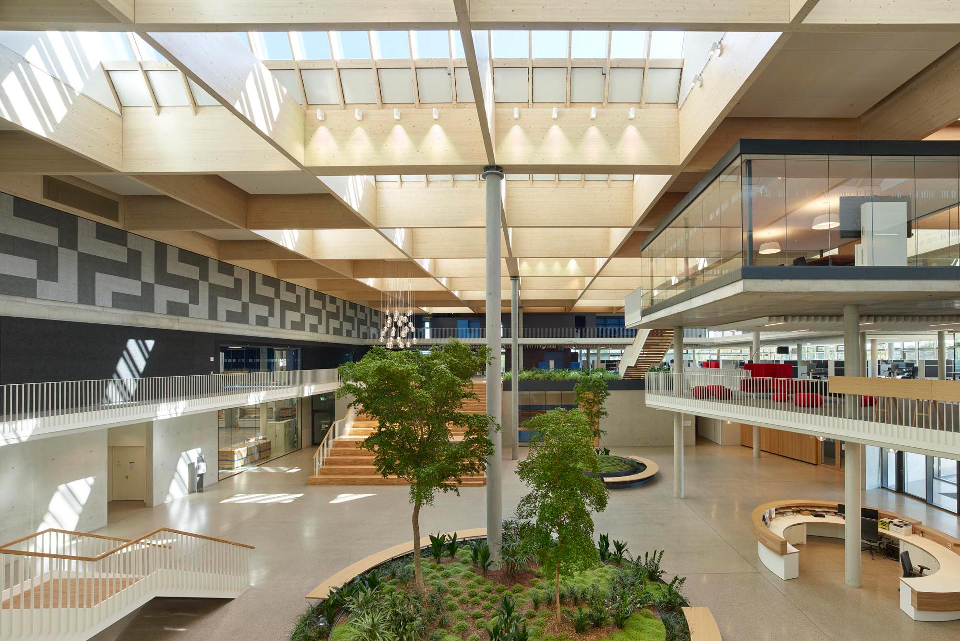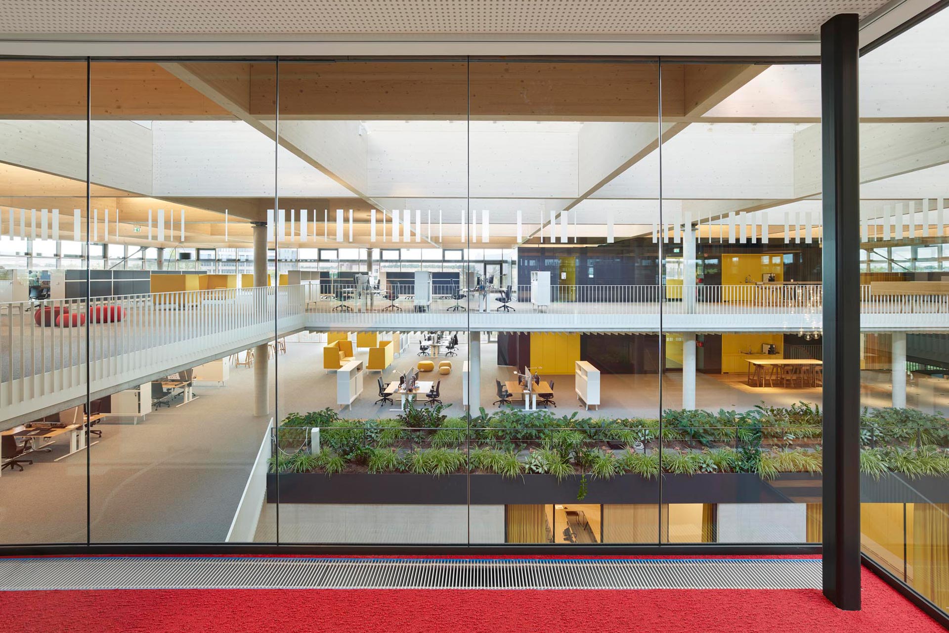 Des espaces de travail ouverts «Open Space» et des zones de réunion informelles sont prévus dans l'atrium central lumineux et verdoyant. le grand atrium étant inclus dans le concept climatique puisqu’il est conçu pour créer un effet de cheminée naturel dans le bâtiment.