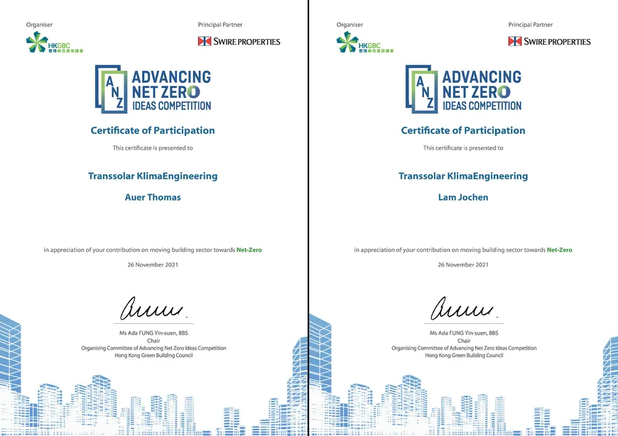 Jochen Lam and Thomas Auer were awarded for their participation in the Advancing Net Zero ANZ competition “in appreciation of their contribution on moving the building sector towards Net-Zero”. The competition was organized by the Hong Kong Green Building Council. Jochen and Thomas were part of the Design team of the winning entry of Ronald Lu & Partners ‘Treehouse’.