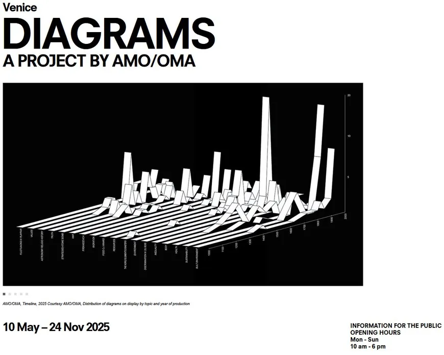 “Diagrams” is an exhibition project conceived by AMO/OMA, the studio founded by Rem Koolhaas, for the Fondazione Prada Venice venue, Ca’ Corner della Regina, investigating the visual communication of data as a powerful tool for constructing meaning, comprehension or manipulation and a pervasive instrument for analyzing, understanding and transforming the surrounding world. It seeks to foster dialogue and speculative reflection on the relationship between human intelligence, scientific and cultural phenomena, and the creation and dissemination of knowledge. ...read on >