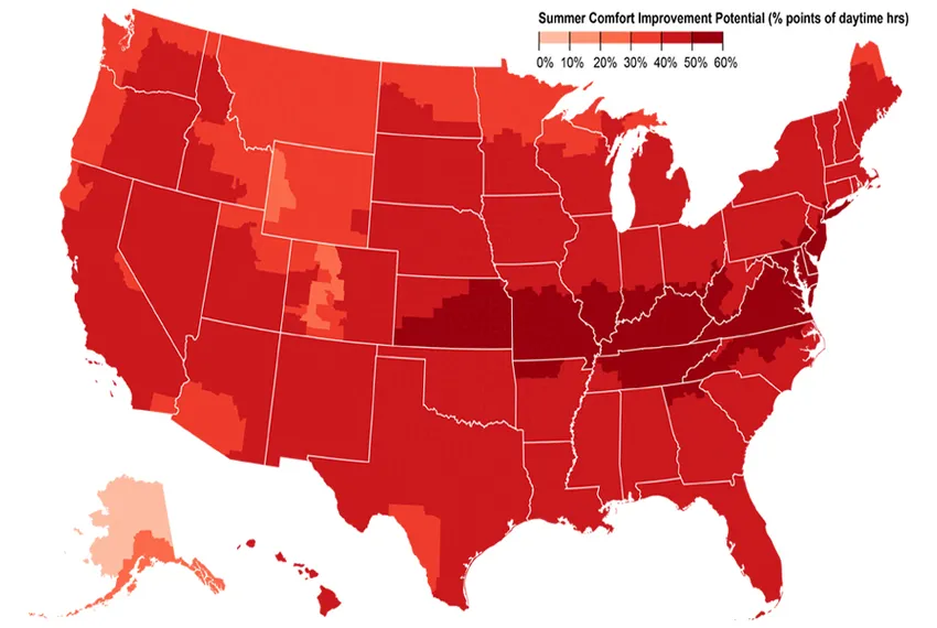 The answer, of course, is a lot! Nate’s results show that the highest potential for increased outdoor comfort – both in the winter and summer – is in climate zones in the middle of the continental US, from the Mid-Atlantic and Southeast across to the southern Midwest and Southwest. The charts below show that 40-50% of the summer and winter that would have been uncomfortable can be made comfortable through design interventions such as improved ventilation, shading, and misting in the summer, and solar access and wind protection in the winter. Outside of this band, most U.S. climates show the potential to make at least an additional 20-30% of the summer and winter comfortable through design.