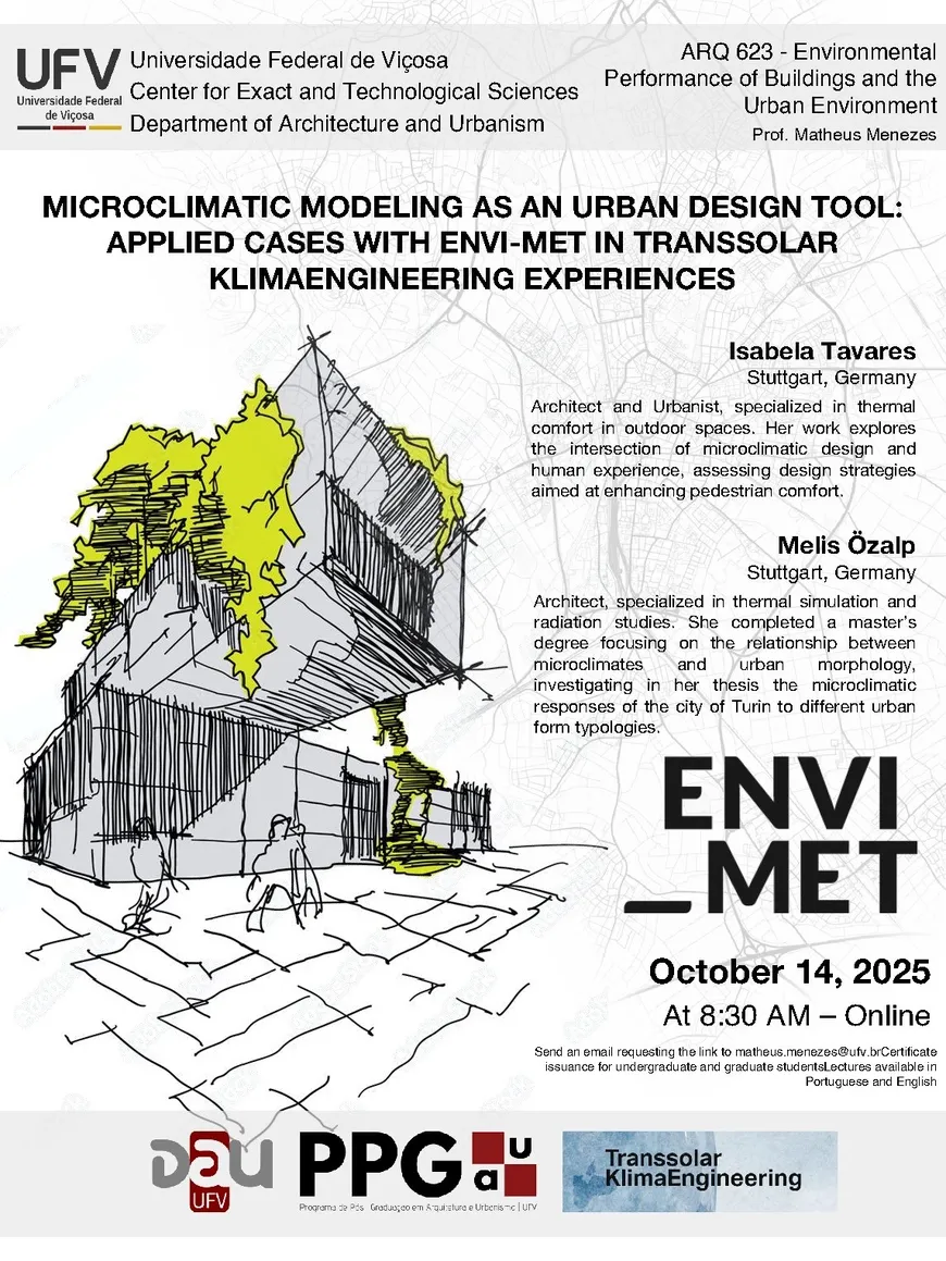 Isabela Tavares and Melis Özalp are giving a guest lecture at the Universidade Federal de Viçosa (UFV) in Brazil. Together they will speak to the students of the Department of Architecture and Urbanism as part of the course Environmental Performance of Buildings and the Urban Environment (ARQ 623), coordinated by Prof. Matheus Menezes.