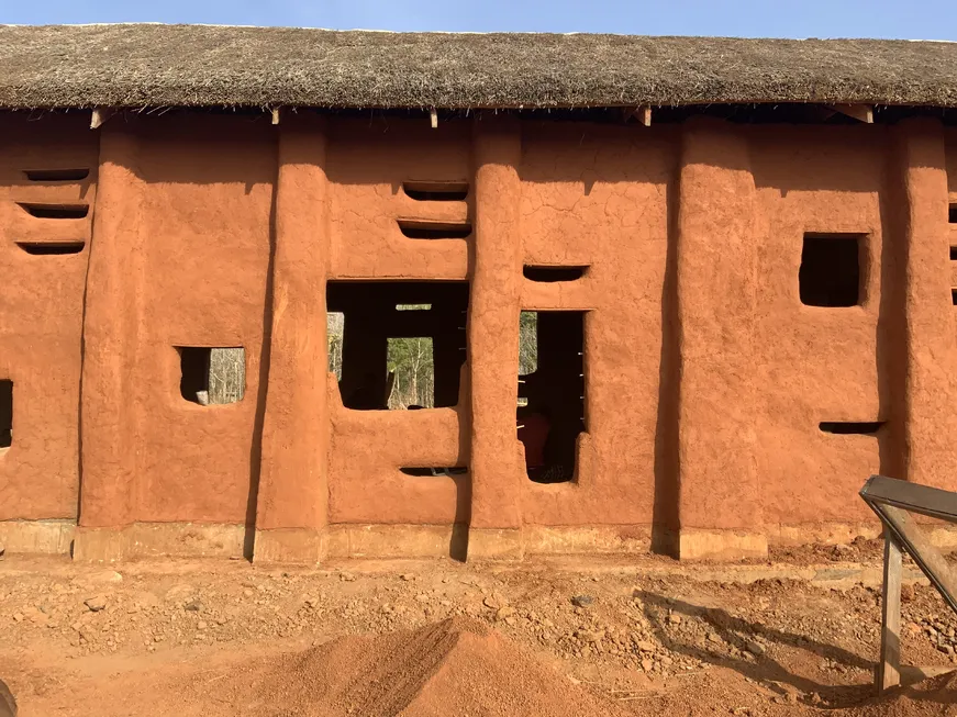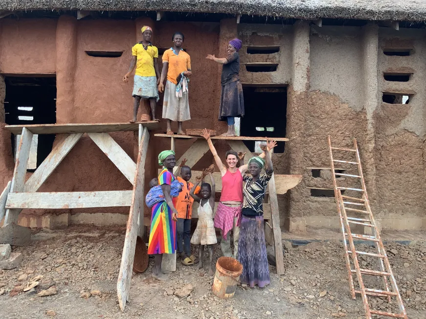 Here, women put fine clay as plaster on the rough load-bearing walls.