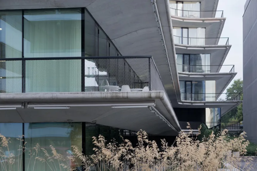 The building is characterized by its floor slabs that are cantilevered beyond the facades, providing employees a balcony-like access to the outside. In addition to the balconyslabs, special operable, exterior awnings, called ‘Knickarmmarkisen‘, provide shading, and therefore, protection from overheating in summer without compromising the occupants’ connection to the outside.
