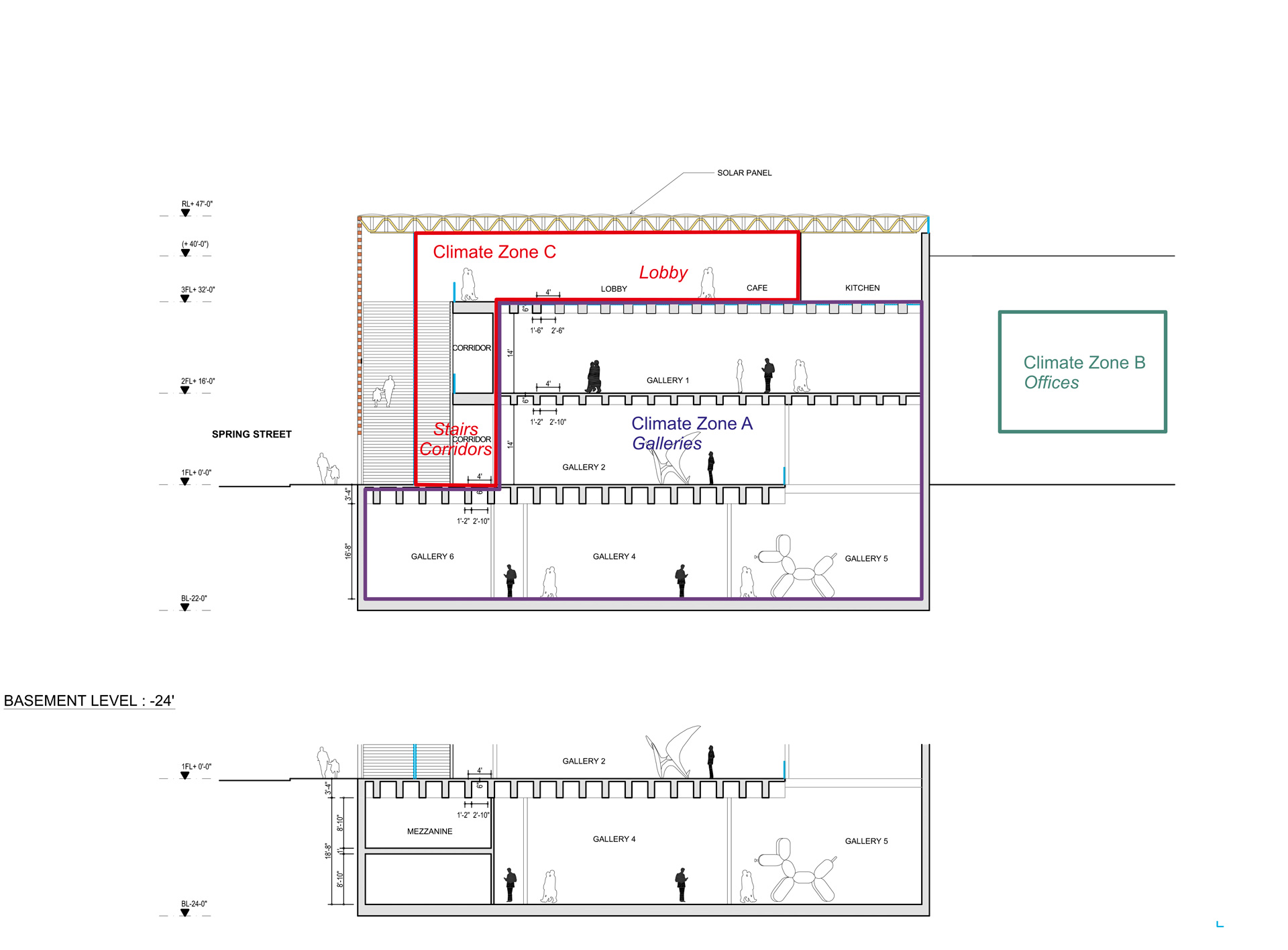 In addition, the remaining space conditioning requirements were met through highly efficient mechanical and energy systems. Geothermal and PV provided thermal energy and electricity to the museum, while radiant heating and cooling, as well as a dedicated outdoor air system efficiently provided the desired indoor environmental conditions. Maintaining these conditions for gallery spaces was also accomplished through strategic zoning of programming and the inclusion of thermal buffer zones into the layout of the building.