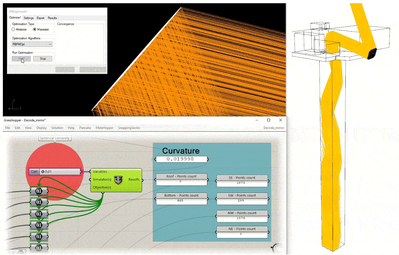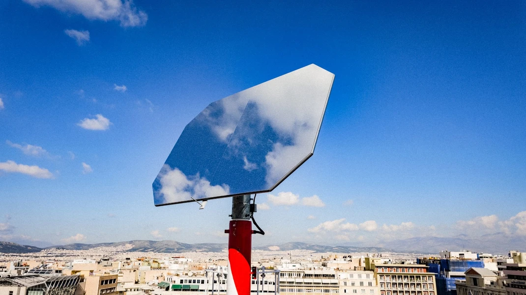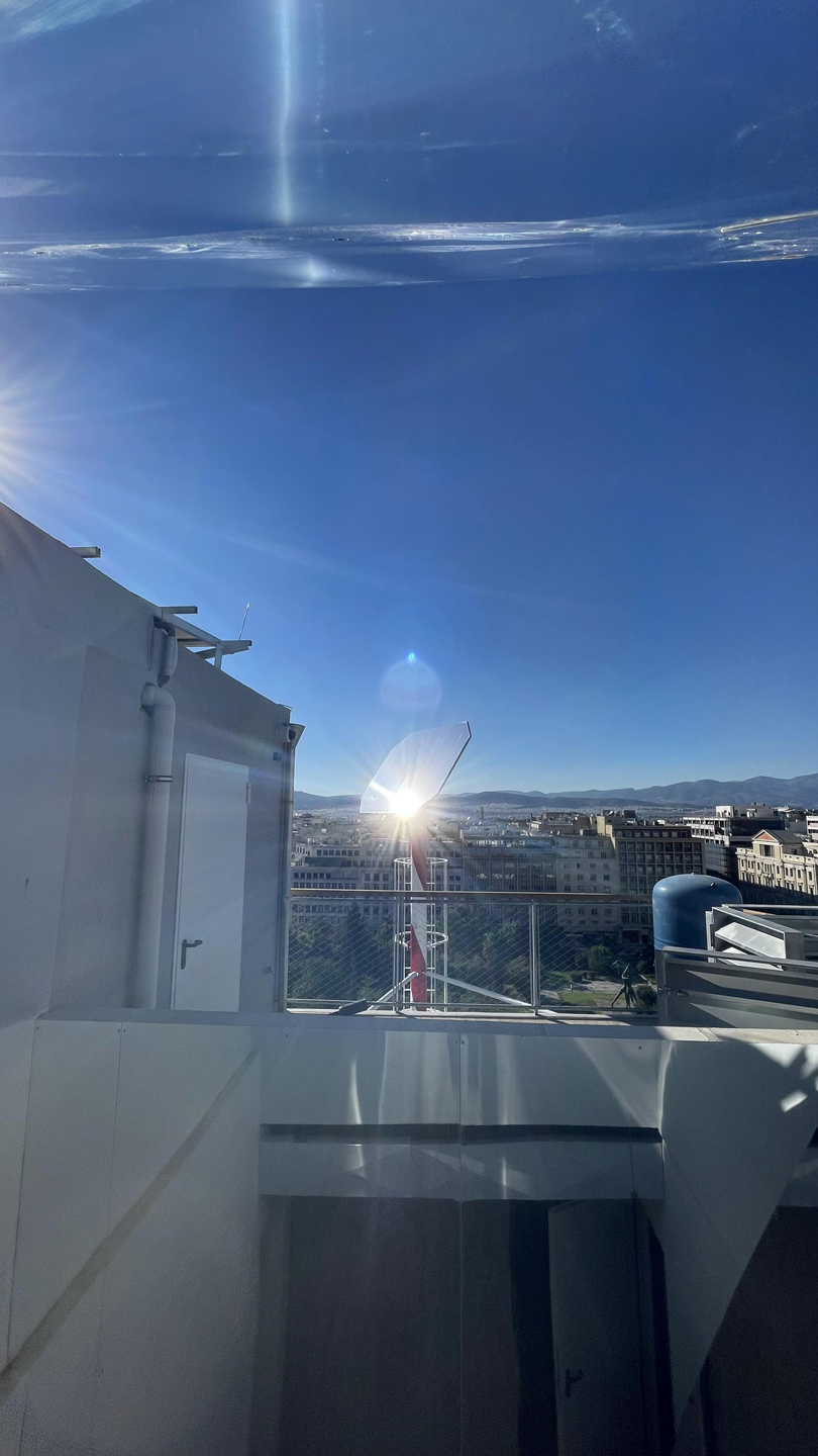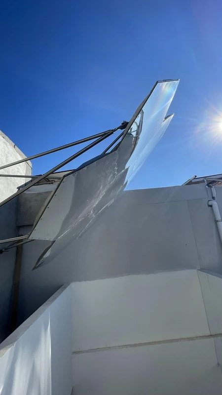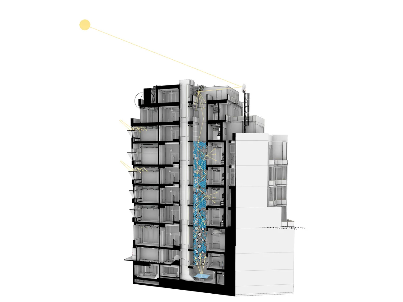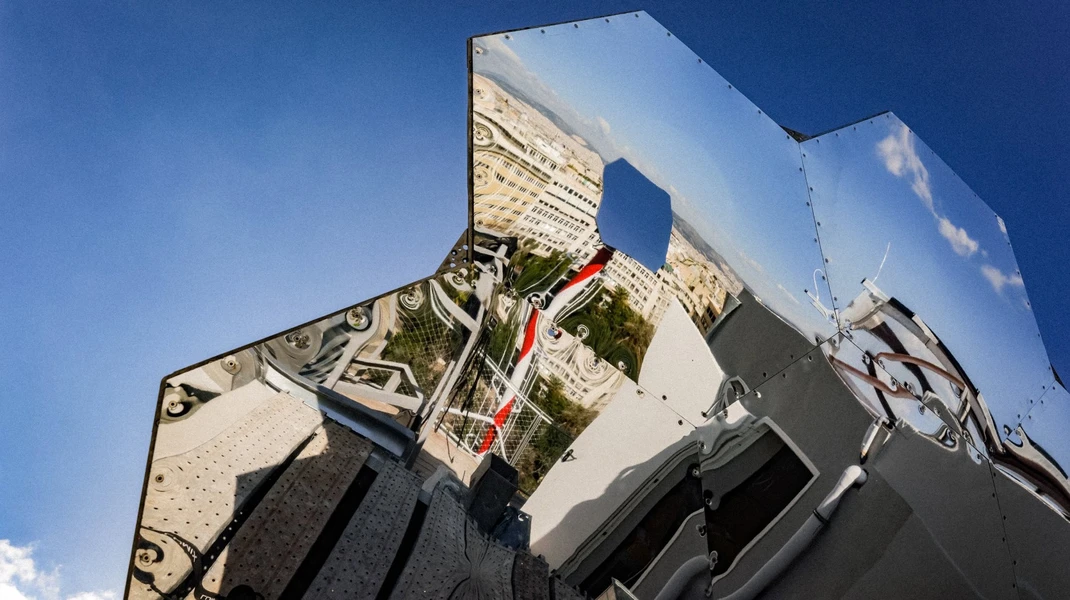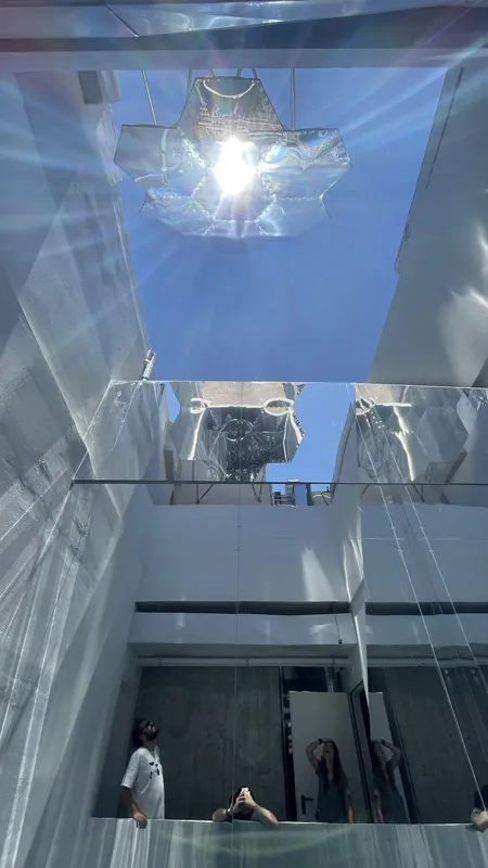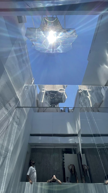 On the roof, a two-mirror heliostat system tracks the sun's path, continuously harvesting sunlight throughout the day and redirecting it into the Kaleidoscope shaft. The sunlight is then reflected downward, entering workspaces and public areas through specially designed openings in the cladding. To maximize the amount of reflected light and reduce its intensity, preventing glare, the team opted for a custom-built spherical convex mirror instead of a flat rectangular one. This secondary mirror, positioned directly above the Kaleidoscope shaft, was designed using parametric modelling and machine learning to achieve the optimal curvature. Inspired by NASA's James Webb Space Telescope, the mirror was constructed from seven hexagonal segments, each of them individually shaped and curved that combined result in the overall mirror shape.