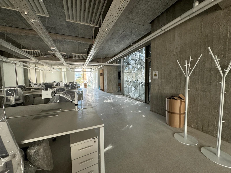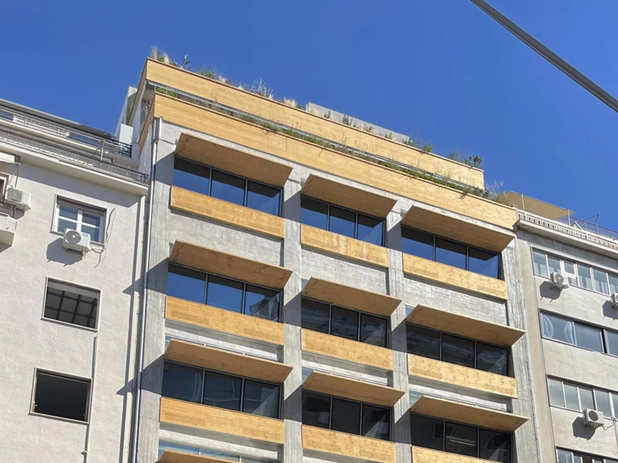 For the nine upper floors of LADA 3, six floors are designated for open-plan offices. These are complemented by a green lobby with a café and lounge on the ground floor, a small auditorium, and meeting rooms on the mezzanine. The top floor features a multipurpose room with a generous terrace that offers an unobstructed view of the Acropolis. Auxiliary spaces, such as changing rooms, are located in the basement.