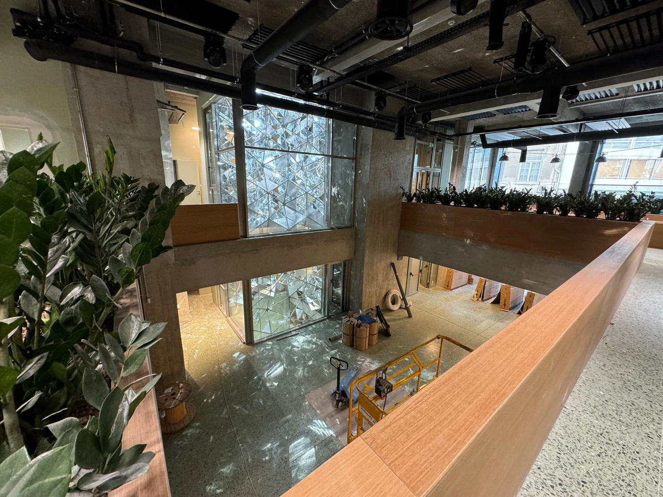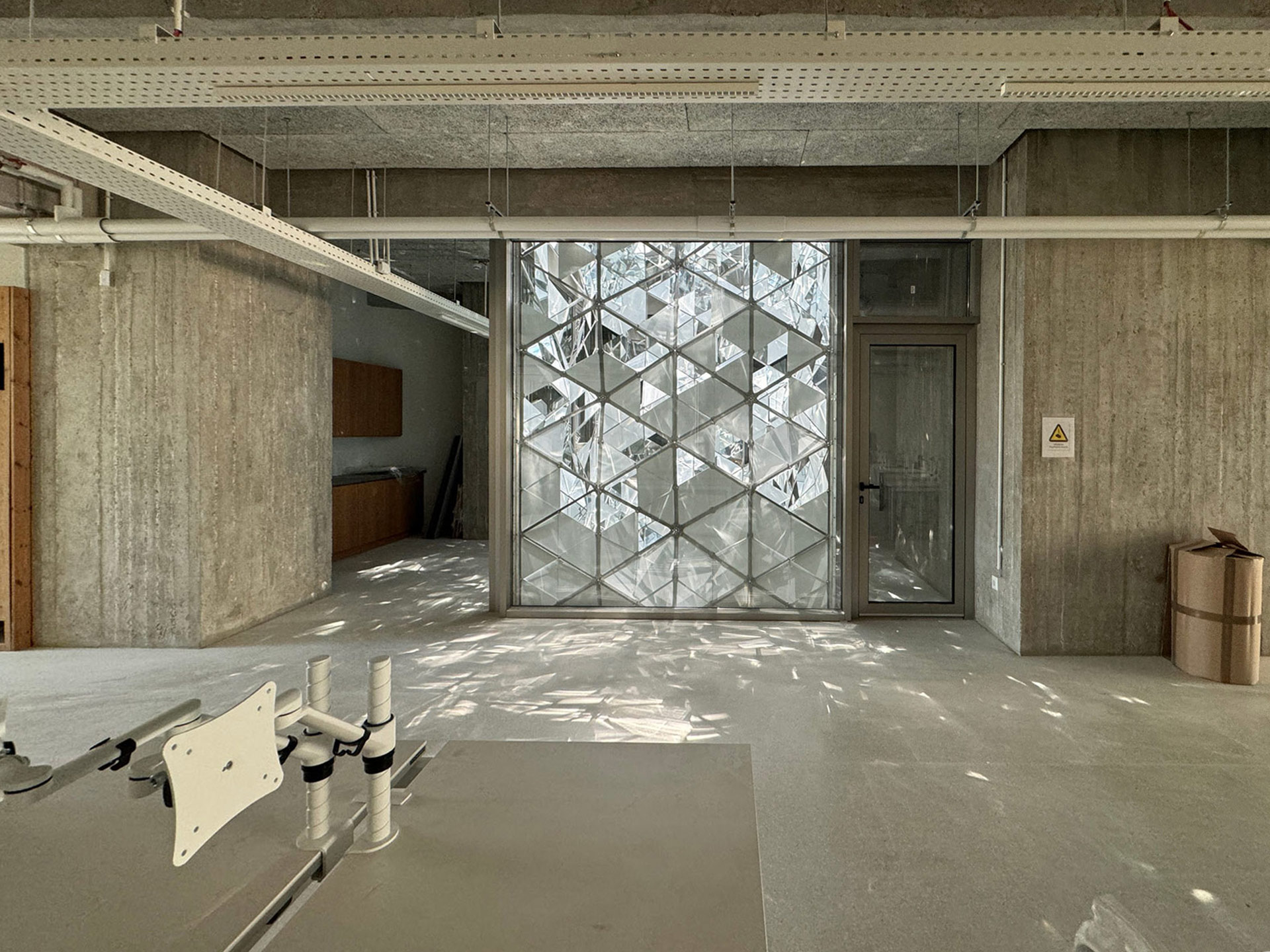 With its elongated footprint and narrow facades, ensuring daylight penetration into the building posed a significant challenge. To guarantee that each office floor receives adequate natural light, the team developed a combination of three systems: The Kaleidoscope is a light shaft strategically placed at the centre of the building, featuring cladding made of prismatic mirrors and white diffusers. At its base, a pyramidal mirror is submerged in a water pool, designed to reflect sunlight back upwards, preventing it from being absorbed by the floor. A controlled water flow in the pool generates ripples, producing reflections and refractive caustics—rainbow-like, wavy light patterns—visible in the ground-floor spaces. An automated system alternates between calm and rippling water periods at fixed intervals, creating a dynamic visual effect and subtly marking the passage of time.