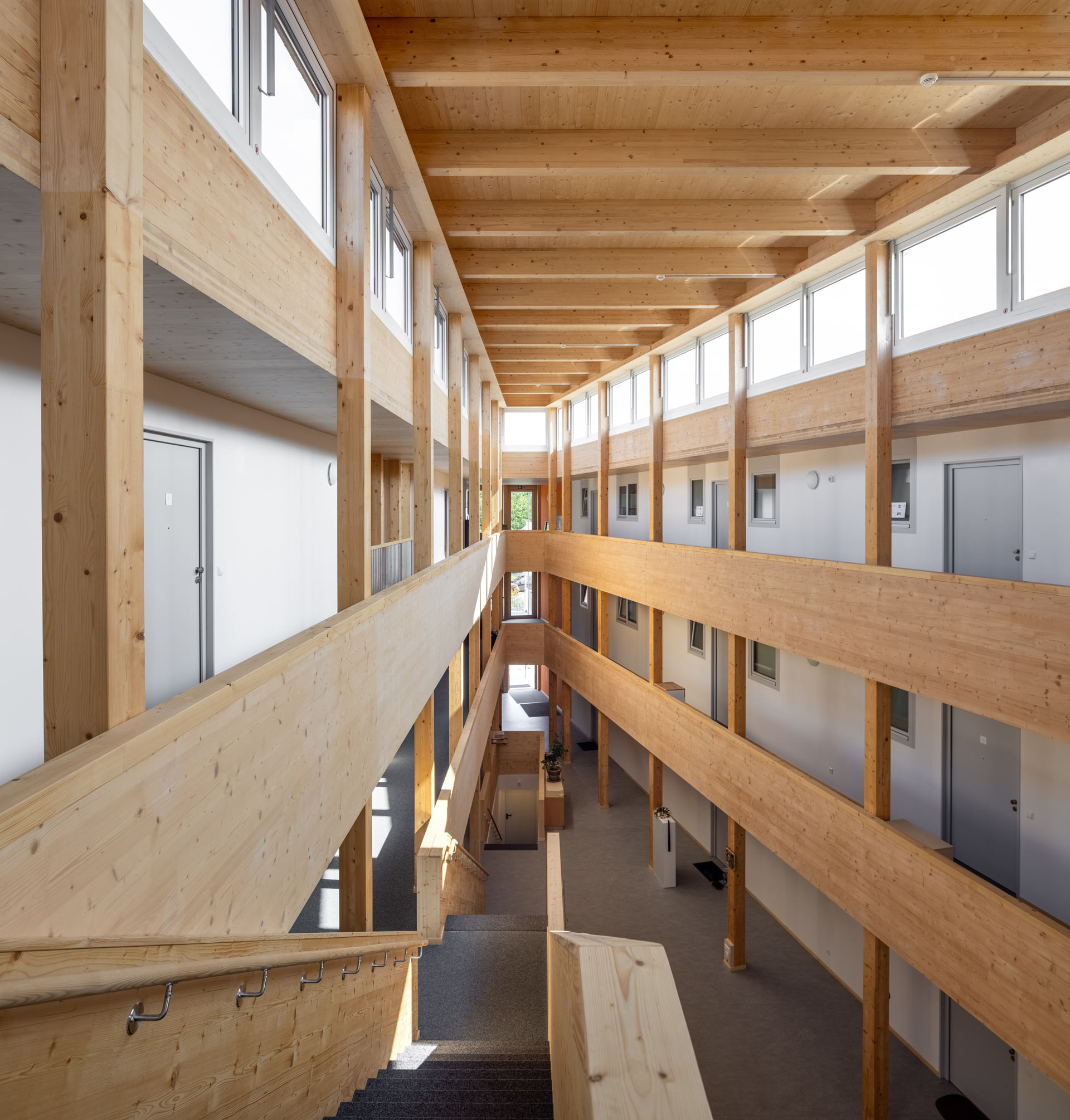 The goals of sustainability, aesthetics of simplicity and cost-effective construction are reflected in the choice of materials, the construction, the joining of the components in wood module construction, as well as in the interface minimization and the plant and heating technology.
