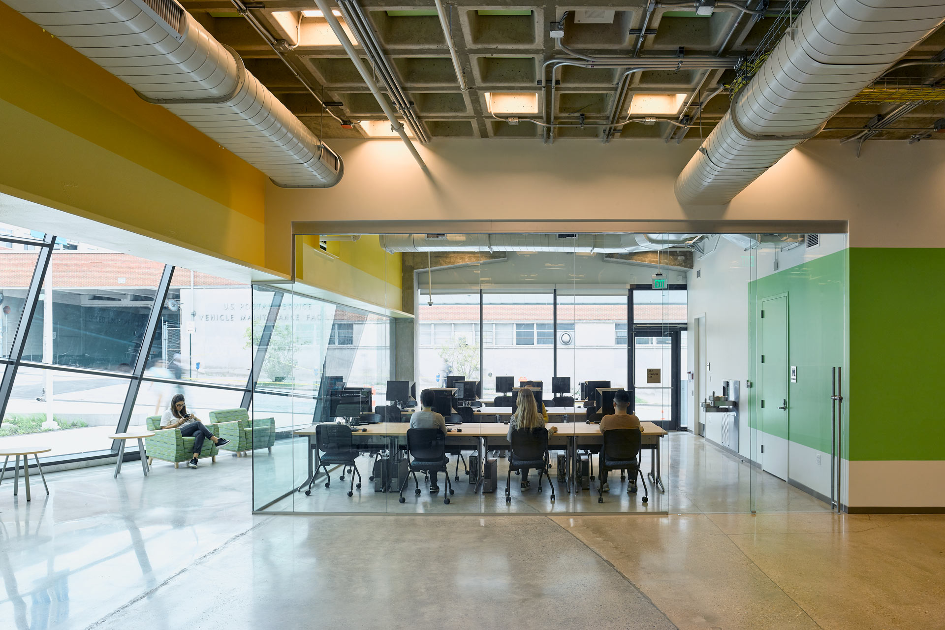 A striking addition of a glass hall on the west façade connects the four levels, providing a contemporary academic and public space to the building. In addition to promoting interior circulation, the glass hall provides daylight, views and natural ventilation to the original floor plate. Transsolar performed extensive thermal studies to detail the interior operable roller shading, including the specifications for materials, openness factor, location and functionality to provide optimum solar control and exhaust the heat built up in the glass hall.