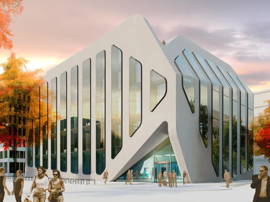 The FOM University of Economics & Management offers academic training opportunities in 31 locations. Under the helm of the FOM University of Applied Sciences, the BCW (BildungsCentrum der Wirtschaft) is planning a new university building in Berlin's Charlottenburg-Wilmersdorf district near the Tiergarten – in accordance with the design plans of the architecture firm J. MAYER H. and Partners. The building's five floors house a foyer with cafeteria, lecture halls, seminar rooms, administrative offices, library / reading room and group room. Underground parking is located in the basement, in addition to technical areas. The monolithic building envelope, interrupted by generously glazed windows, is the main characteristic of the building as well as the formative and identity-creating architecture. The windows are conceived as a 2-shell construction of box windows. They are of course ventilated by means of permanent openings and sealed off floor by floor. The box windows take on the motor-driven sunscreen. The inner primary façade can be opened manually. Using lightweight concrete, there is no core insulation in the opaque façade components. The objective is the development of a high-quality building with innovative, structural measures, minimized and efficient building technology with good user comfort and low energy requirements. On all levels, a cavity floor with regularly arranged maintenance openings provides the necessary flexibility with regard to changes in usage units, room layouts and media distribution. The comfort concept uses the thermally activated component mass in the foyer floor or in the exposed, massive ceiling areas of the main usable areas. Thermally highly loaded seminar rooms and lecture halls also have acoustically effective cooling ceiling panels. Additional heat loads are dissipated convectively via ground-integrated fan coils. The entire building is mechanically ventilated; the air change rates are adjusted according to CO₂ requirements. The heat supply is provided by the district heating network of Berlin. Wherever possible, the cooling requirements of the building are met by free, adiabatic cooling by means of re-cooling systems on the roof and by ventilation-integrated exhaust air humidification.