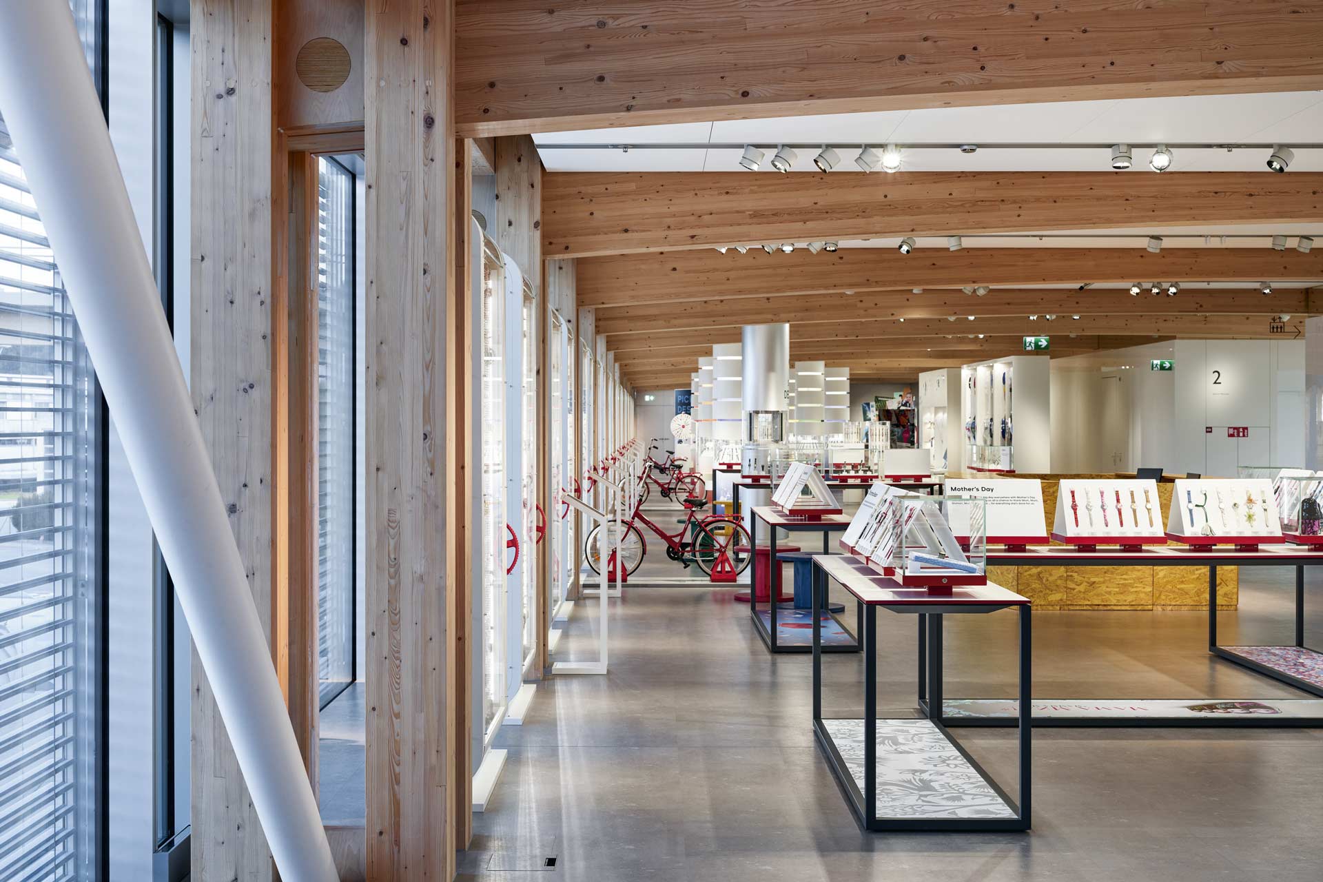 With 1,997 m³ / 70,523 ft³ of indigenous spruce timber, this campus is one of the largest hybrid timber constructions. The three buildings - the Swatch Headquarters, the Omega Factory and the Museum Cité du Temps – are speaking a uniform design language: they share a common material palette and environmental awareness. Each strategy implemented in the project is designed to minimize global impact and serve as a model for future buildings. To achieve an energy-efficient, comfortable working environment, radiant cooling and heating with activated ceiling panels or water pipes embedded in the concrete ceilings are used. The campus uses the regenerative energy potential of groundwater from wells: for heating, heat pumps "collect" the relative heat of the water from the subsurface. The heat itself is free of charge, only the heat pumps need electricity for operation but deliver considerably more energy than they need for operation. When cooling is required, the groundwater is cold enough to lower the temperature in the cooling circuit of the radiant cooling system via heat exchangers: operation in summer does not require heat pumps. Thus, in addition to the heat, the cold is also regenerative and only takes the rather low amount of electrical energy for the pumping. All roofs carry PV modules on surfaces facing southeast or southwest and cover part of the electricity requirement.