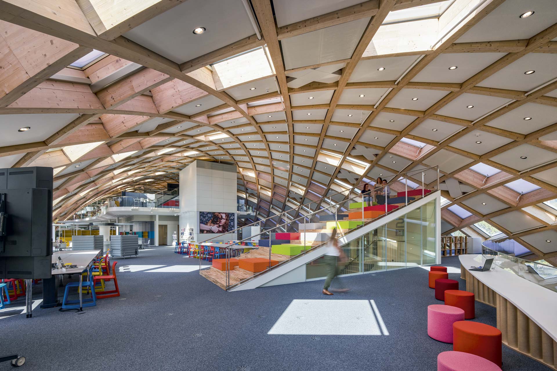 With 1,997 m³ / 70,523 ft³ of indigenous spruce timber, this campus is one of the largest hybrid timber constructions. The three buildings - the Swatch Headquarters, the Omega Factory and the Museum Cité du Temps – are speaking a uniform design language: they share a common material palette and environmental awareness. Each strategy implemented in the project is designed to minimize global impact and serve as a model for future buildings. To achieve an energy-efficient, comfortable working environment, radiant cooling and heating with activated ceiling panels or water pipes embedded in the concrete ceilings are used. The campus uses the regenerative energy potential of groundwater from wells: for heating, heat pumps "collect" the relative heat of the water from the subsurface. The heat itself is free of charge, only the heat pumps need electricity for operation but deliver considerably more energy than they need for operation. When cooling is required, the groundwater is cold enough to lower the temperature in the cooling circuit of the radiant cooling system via heat exchangers: operation in summer does not require heat pumps. Thus, in addition to the heat, the cold is also regenerative and only takes the rather low amount of electrical energy for the pumping. All roofs carry PV modules on surfaces facing southeast or southwest and cover part of the electricity requirement.