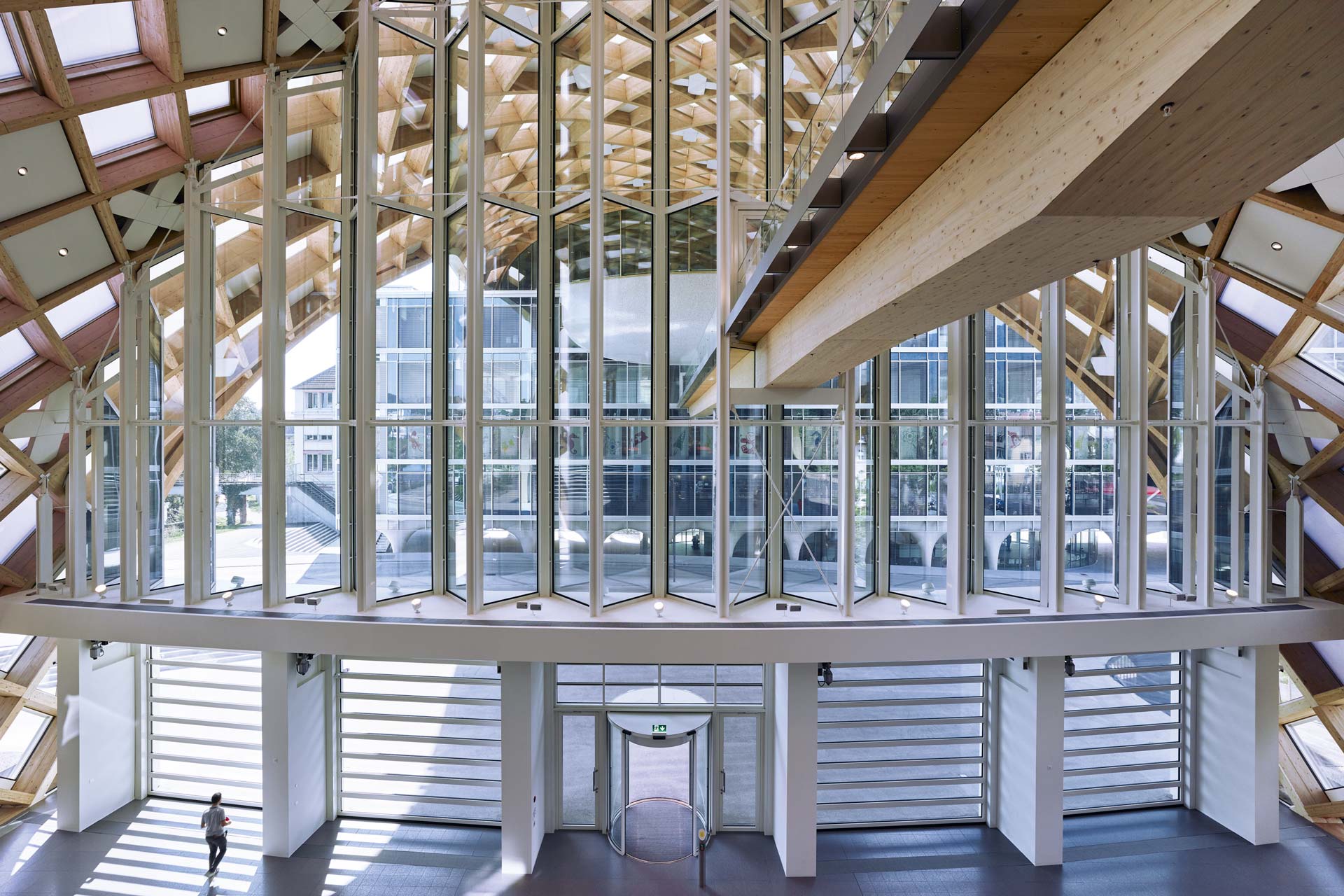 The new office wing with its winding dragon's body seems to reach across the street for the neighboring museum; 240 m / 787 ft long, 35 m / 115 ft wide and 27 m / 88,5 ft high above the street. A bridge on the third floor connects the office building with the "Cité du Temps" across the street. The grid roof construction consists of 4,600 individual wooden elements. Manufactured with high precision, the parts fit into each other. The building concept is geared to the comfort of the employees and increases well-being and productivity: acoustic elements are inserted into the concrete ceilings and a concrete core activation system provides thermal comfort. The mechanical basic ventilation covers the minimum hygienic requirements, the supply air enters the building according to the displacement principle, thus minimizing the risk of draughts and ensuring high ventilation efficiency. There are also operable windows.