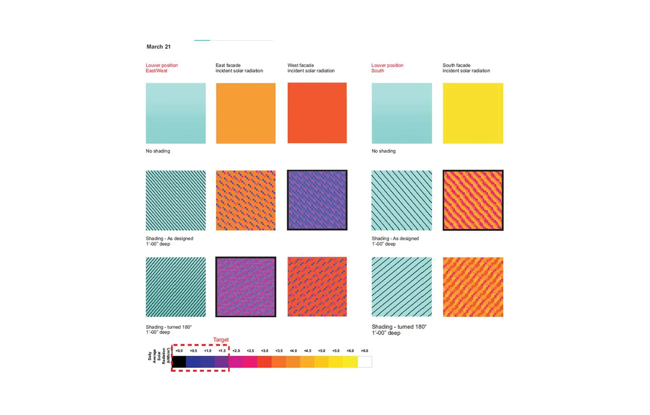Transsolar led the team in showing BU how they could build Boston’s largest carbon-neutral building since the 2019 update of the city's Climate Action Plan. Two different facade systems - exterior diagonal louvers and a sawtooth facade pattern -are used for solar shading. Transsolar optimized the design of these systems, which contribute to the iconic appearance of the building and ensure the best possible overall thermal and daylight performance. Minimizing heat losses through the building envelope is also of key strategic importance. To this end, triple glazing with a double low-e coating is used throughout. The overall insulating performance of the curtain wall was optimized in several iterations to ensure energy-efficient thermal comfort.