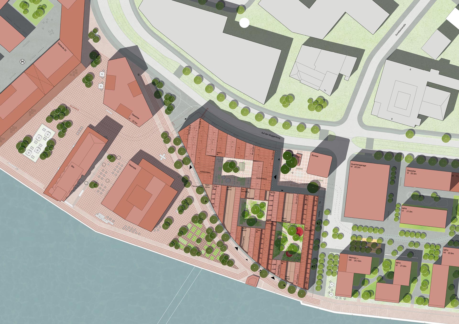 Suitable areas on the roofs generate energy with photovoltaics; the electricity generated is used throughout the Überseeinsel via the neighbourhood grid, where it is also used to generate heat and cooling. Rainwater from the roof surfaces is collected decentrally and can be used as garden water. The facades of the upper floors are to be predominantly made of colored pigmented wood and will also show the wooden construction to the outside.