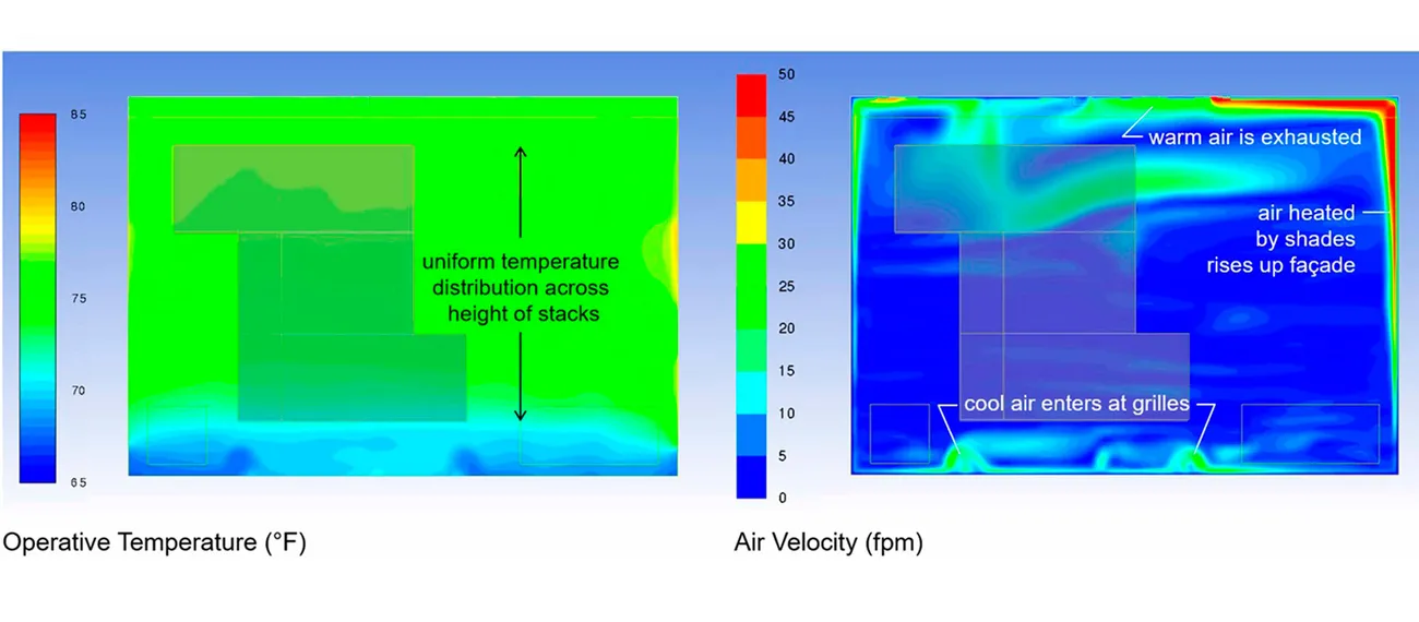 Transsolar embraced the challenge of limited alterations allowed to the historic façade despite the ambitious energy and comfort goals established by Cornell. The lofty architectural vision includes the suspension of the entire stack area in the center of the building, literally showcasing the very soul of the new Fine Arts Library. The renovation replaced the original steel-framed windows, made up of many small panels, with oversized insulated glazing, with a single pane for each large façade opening. When combined with insulation added on the interior of the existing façade, heat loss through the envelope was dramatically reduced.