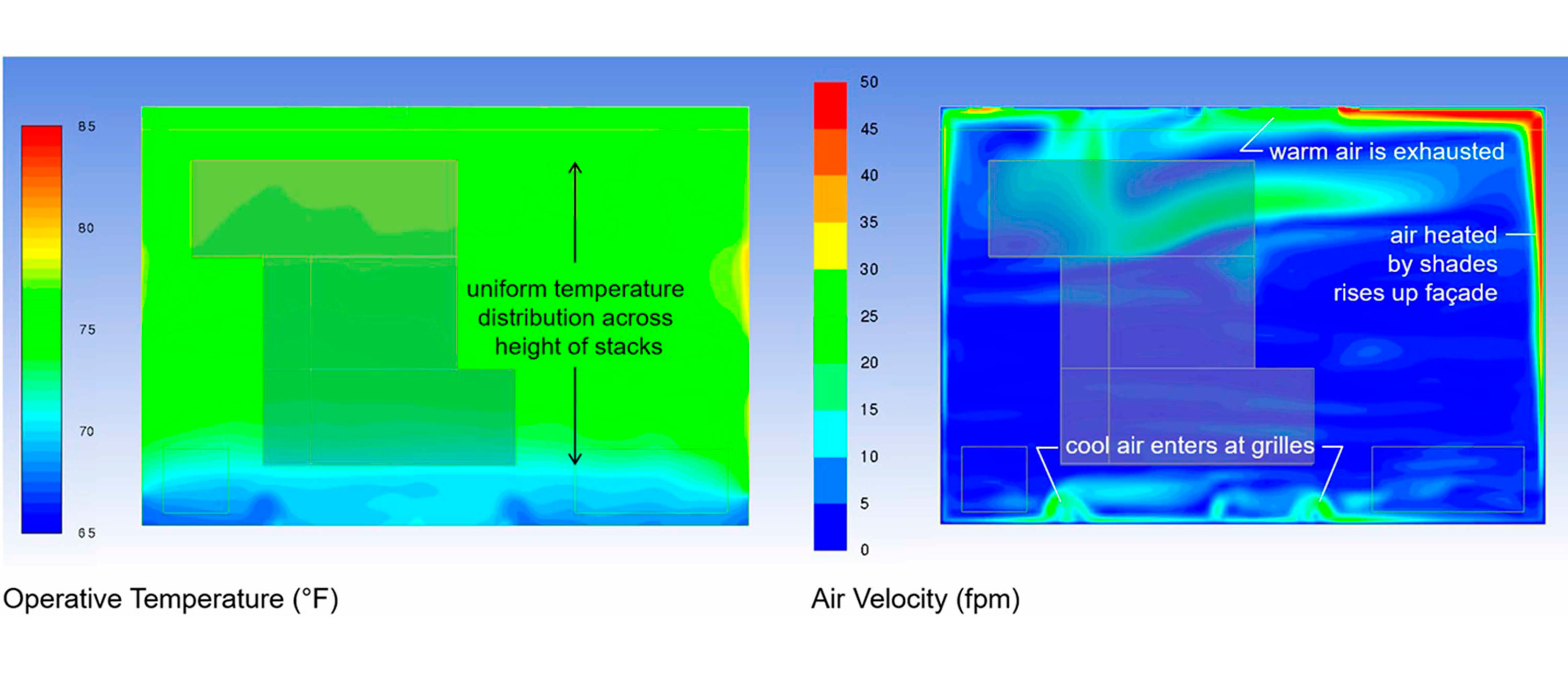 A façade-integrated mechanical design minimizes the presence of systems, especially in the book volume. Interior roller shades on the oversized glazing close on sunny days, while slightly cool outside air is supplied low to the floor, near occupants. Warm air from the shades flows up the façade and is exhausted before entering the stacks. Radiant tubing in the floor of the library covers any remaining heating and cooling together with heating elements hidden beneath the windows.