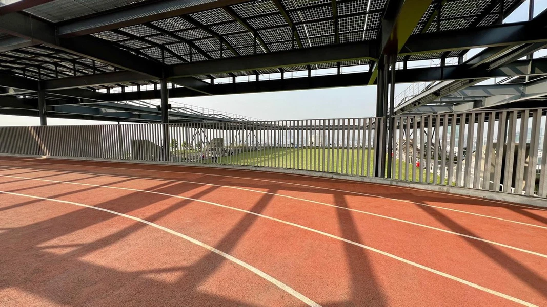The total electrical energy demand is reduced by about 40% compared to conventional design. About 25% thereof is covered by photovoltaics harvested on the overarching roof.