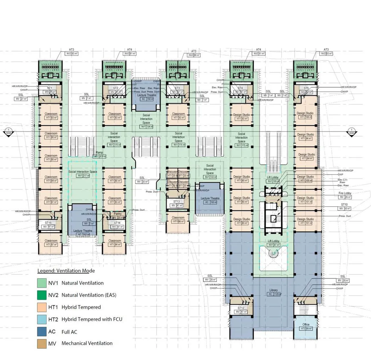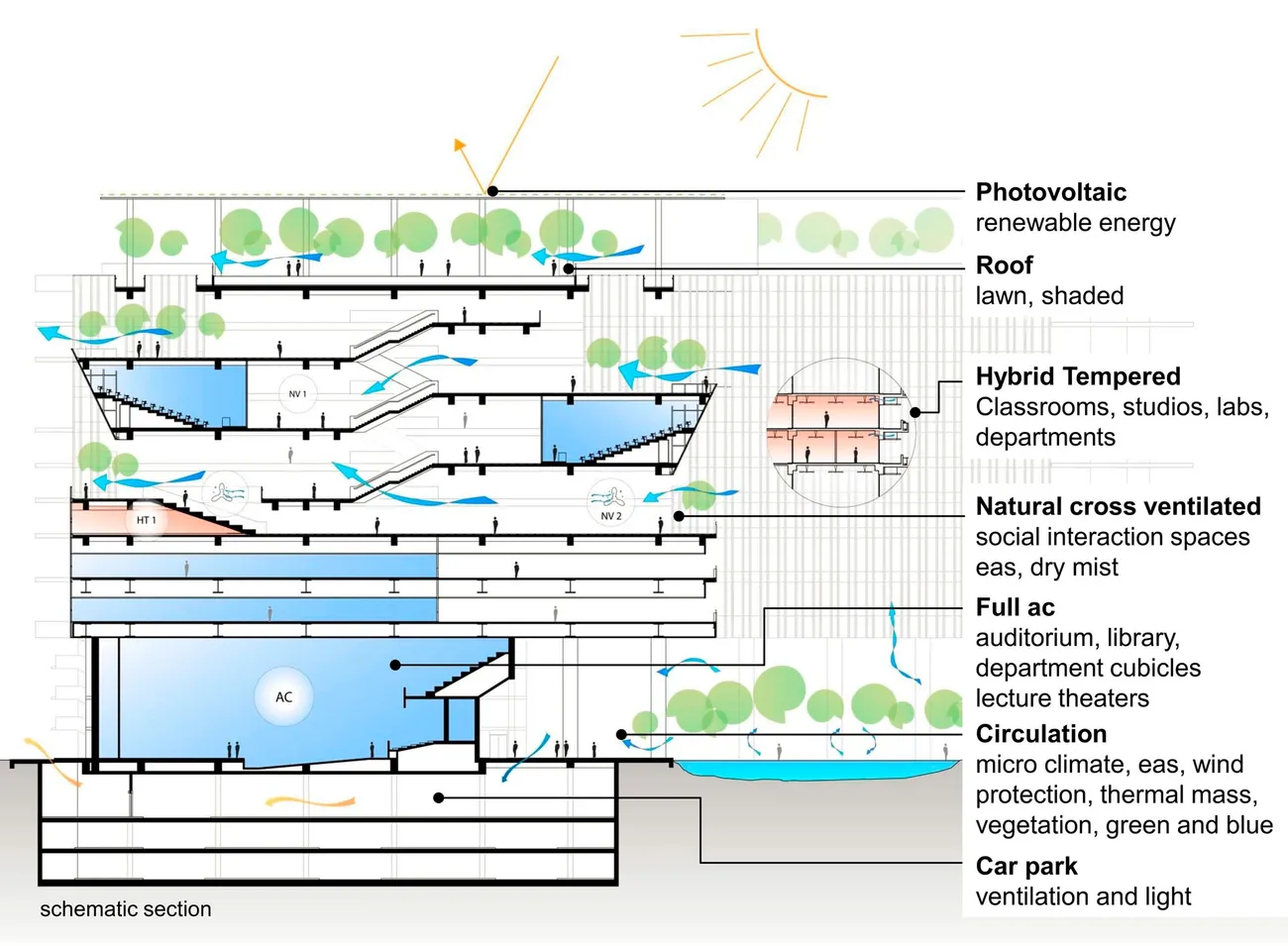The building is designed with plenty of open breezeways creating about 40 % of the area as natural ventilated semi enclosed informal interaction spaces. Only where needed, decentral mechanical systems are located floor by floor and central mech rooms and shafts are reduced to a minimum. Water recycling and rainwater collection reduces water use by nearly 50%. Photovoltaic panels and beekeeping transform the roof into a productive environment. The new university building hosts about 17,000 people in one single building of about 100,000 m² on 11 floors.
