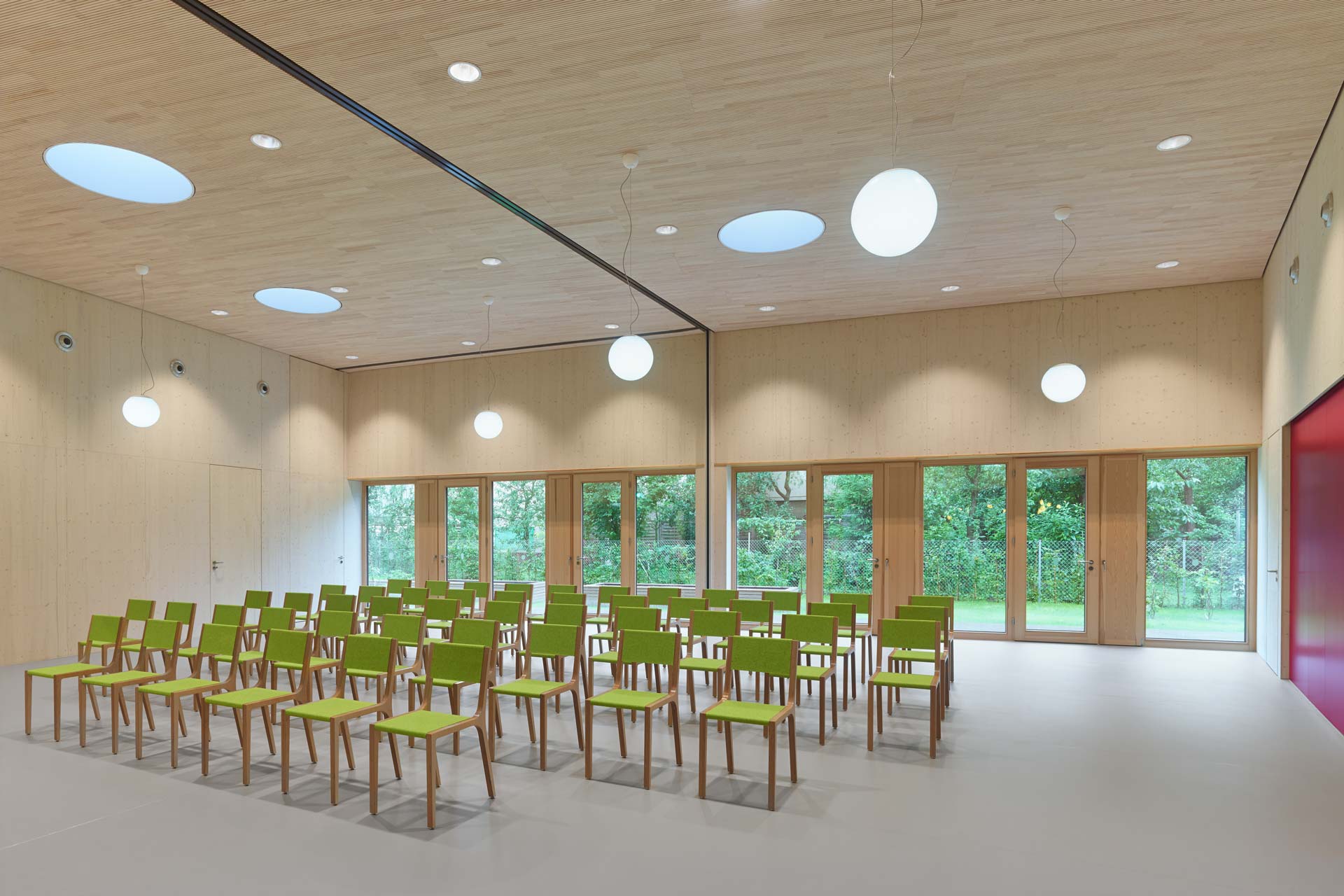 The Kinderhaus Schloss in Ditzingen is a new daycare facility, built environment-friendly in a timber-frame construction. The building shell meets the requirements of the passive house standard with triple glazing and excellent thermal insulation. There is space for up to 110 children in several rooms for different purposes, such as group and rest rooms, creative and work rooms, a multi-purpose room which can function as cafeteria or event room. All lounges are controlled and energy-efficiently ventilated with highly efficient heat recovery and zone control. In summer, the building can be passively cooled by night air flushing.