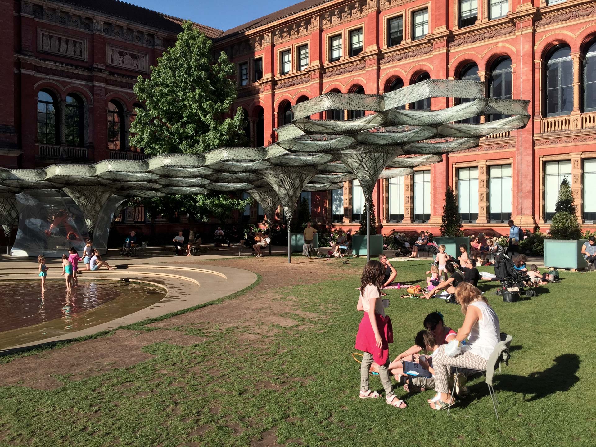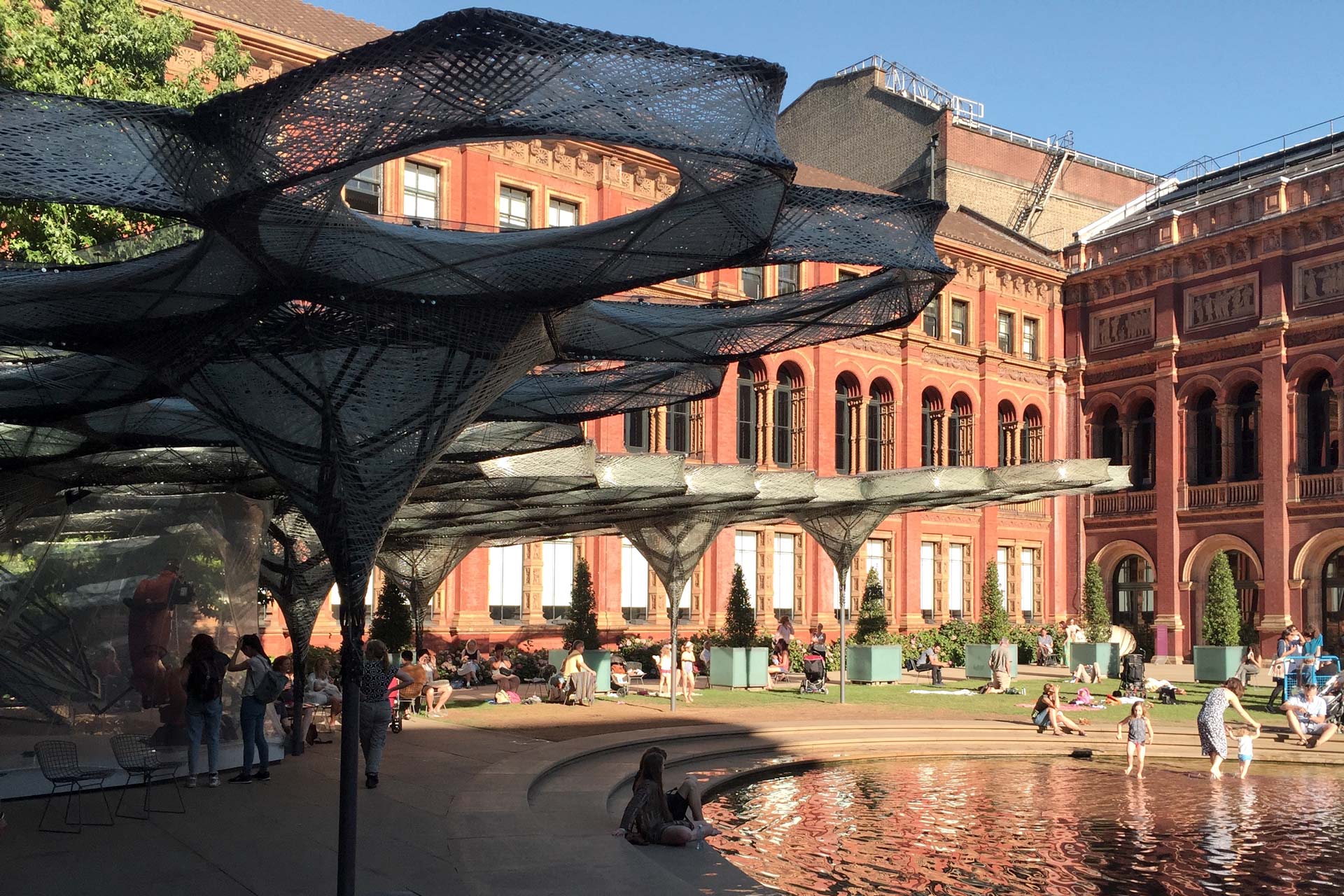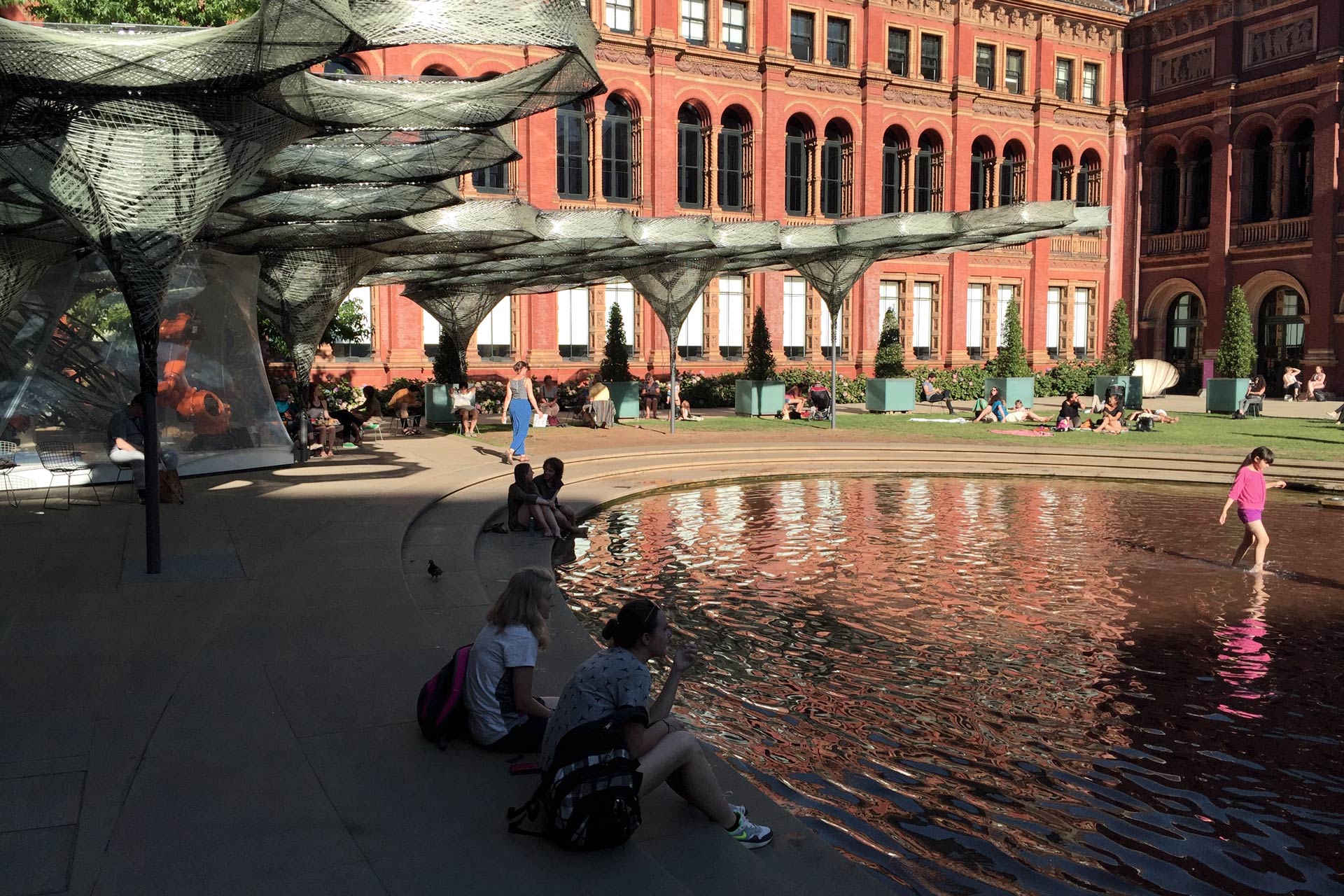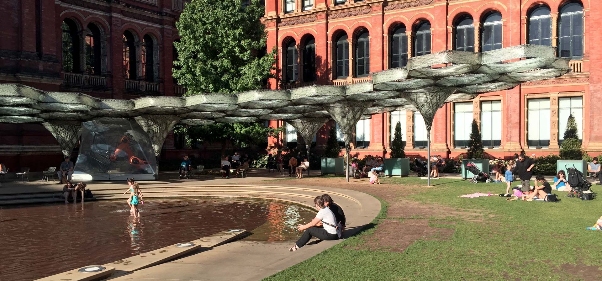 Inspired by a lightweight construction principle found in nature – elytra are the fibrous forewings of flying beetles – the Pavilion was an undulating canopy of tightly-woven carbon fibre cells created with a novel robotic production process. The Pavilion grew over the course of the V&A Engineering Season in response to data on structural behavior and patterns of occupancy in the courtyard, i.e. an evidence-based design method was employed. This data was captured by sensors in its canopy fibres.