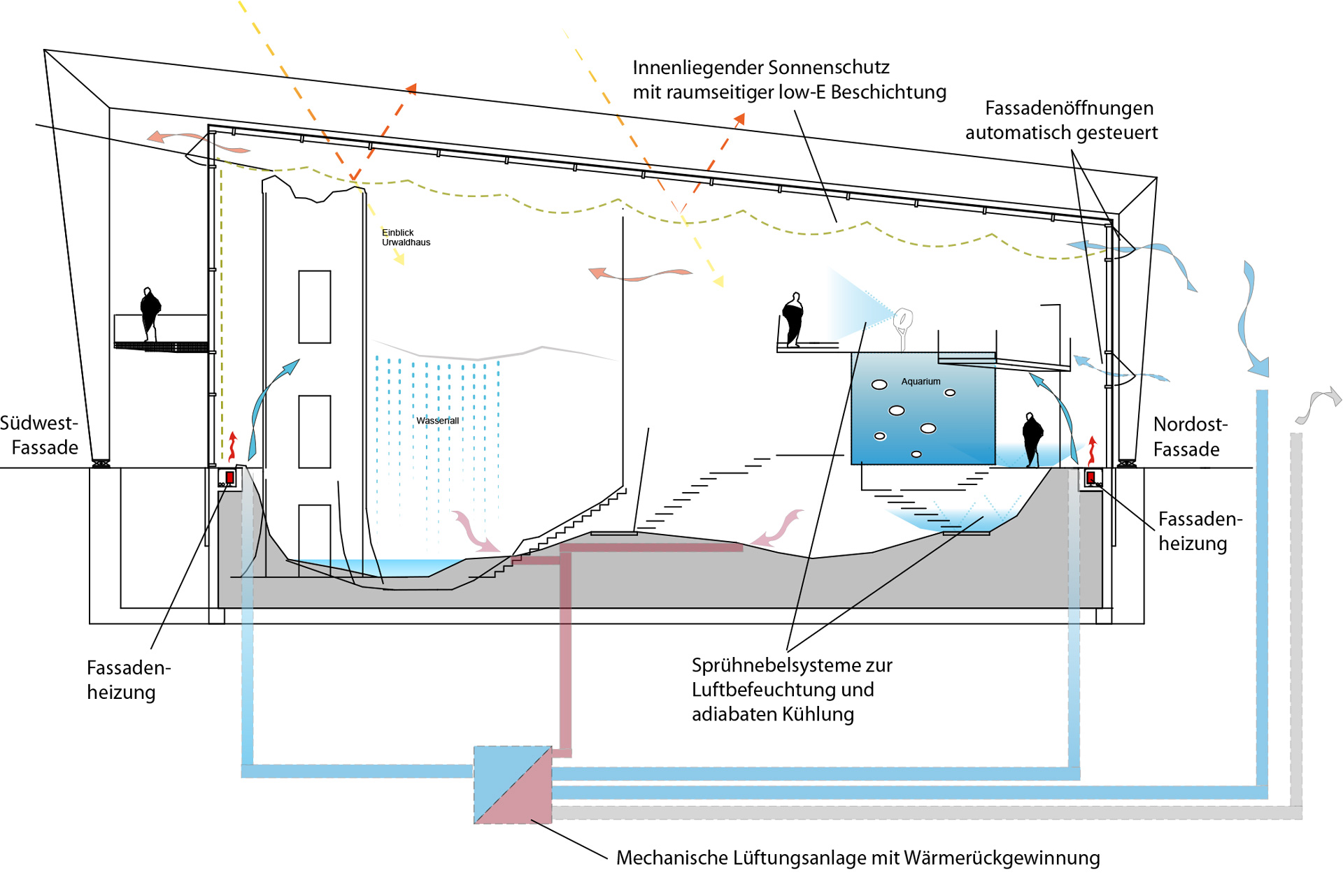 In an integral planning approach, the indoor climate concepts were developed to optimally correspond to specific requirements of the respective climate zones. The simulation goals were to depict climate conditions as realistically as possible, to create optimal conditions for the life of plants and animal populations, to combine this with a sustainable visitor experience and also to operate the building as energy-efficiently as possible. Computer-aided dynamic simulation models were used for a detailed analysis, evaluation and optimization of the concepts.