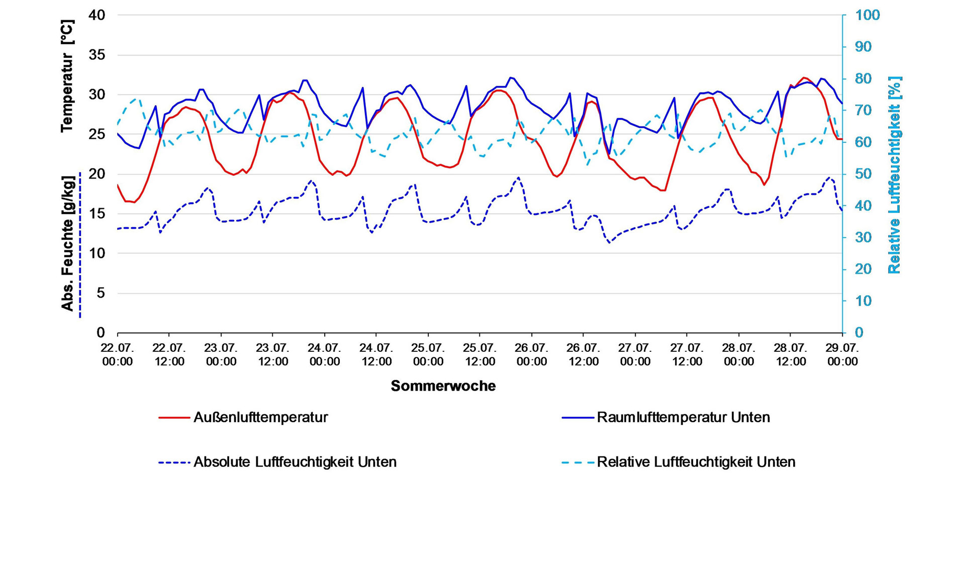 In the morning, natural ventilation is used first, and the fog system is then switched on to keep the indoor temperature close to the outdoor temperature. The humidity increases in the process, indicated in the diagram in absolute humidity (usually measured in grams per cubic meter g/m³). Relative humidity is measured in percent and is optimally around 70% in the Jungle House. At around 8 p.m., the windows close, the fog system is activated in order to slow the temperature peak inside. At night, the windows are minimally open. (See graph below)