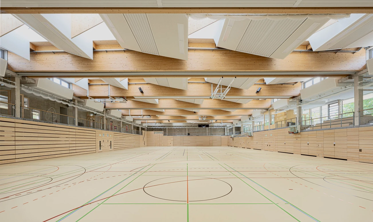 Transsolar’s contribution focuses on the BBGZ and, in particular, on the sports hall, whose climate concept is strongly shaped by requirements for comfort, energy efficiency and glare-free daylight use. The column-free four-court hall with spectator seating spans approximately 30‑metre-long truss girders and is designed to accommodate school and club sports as well as large public events.