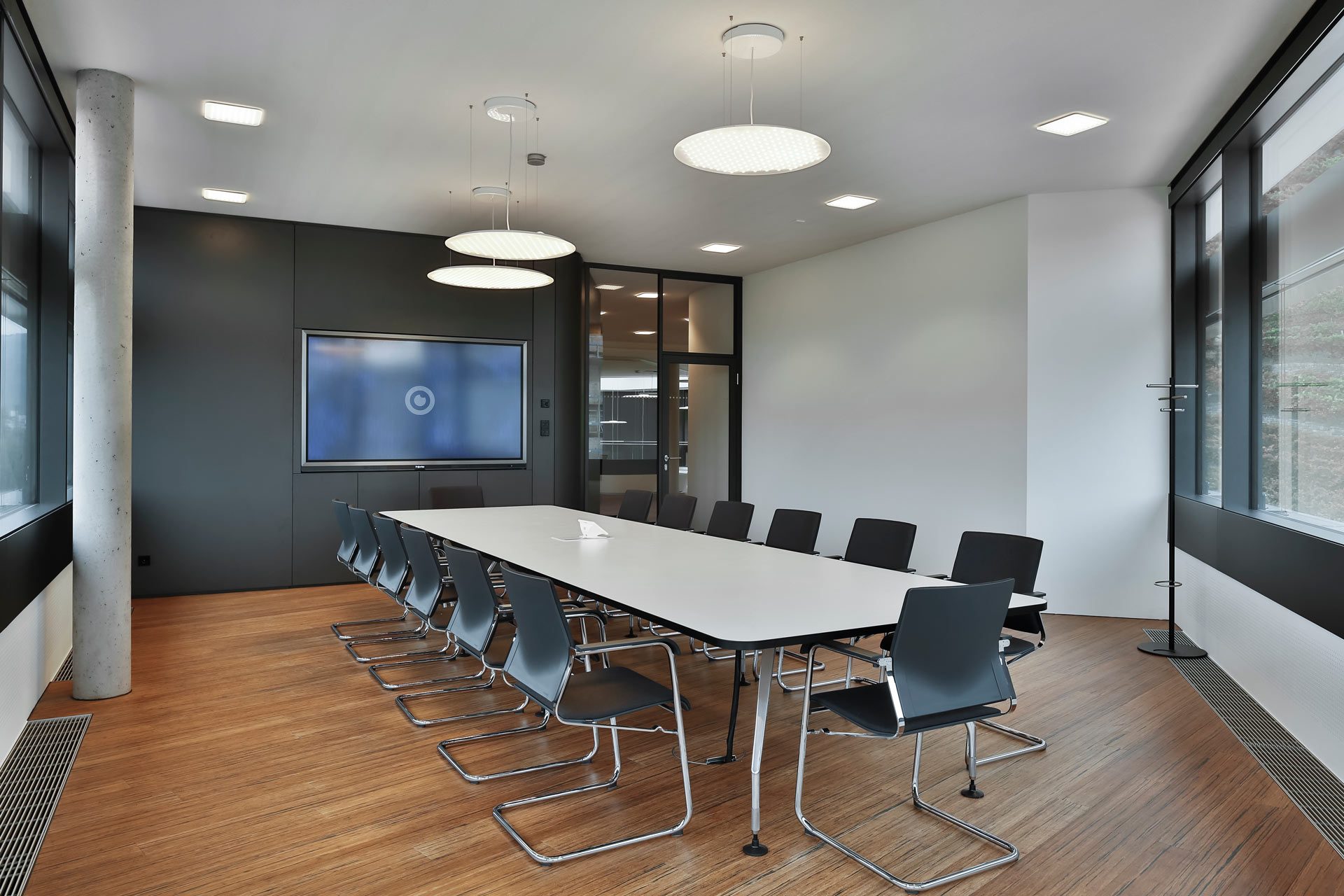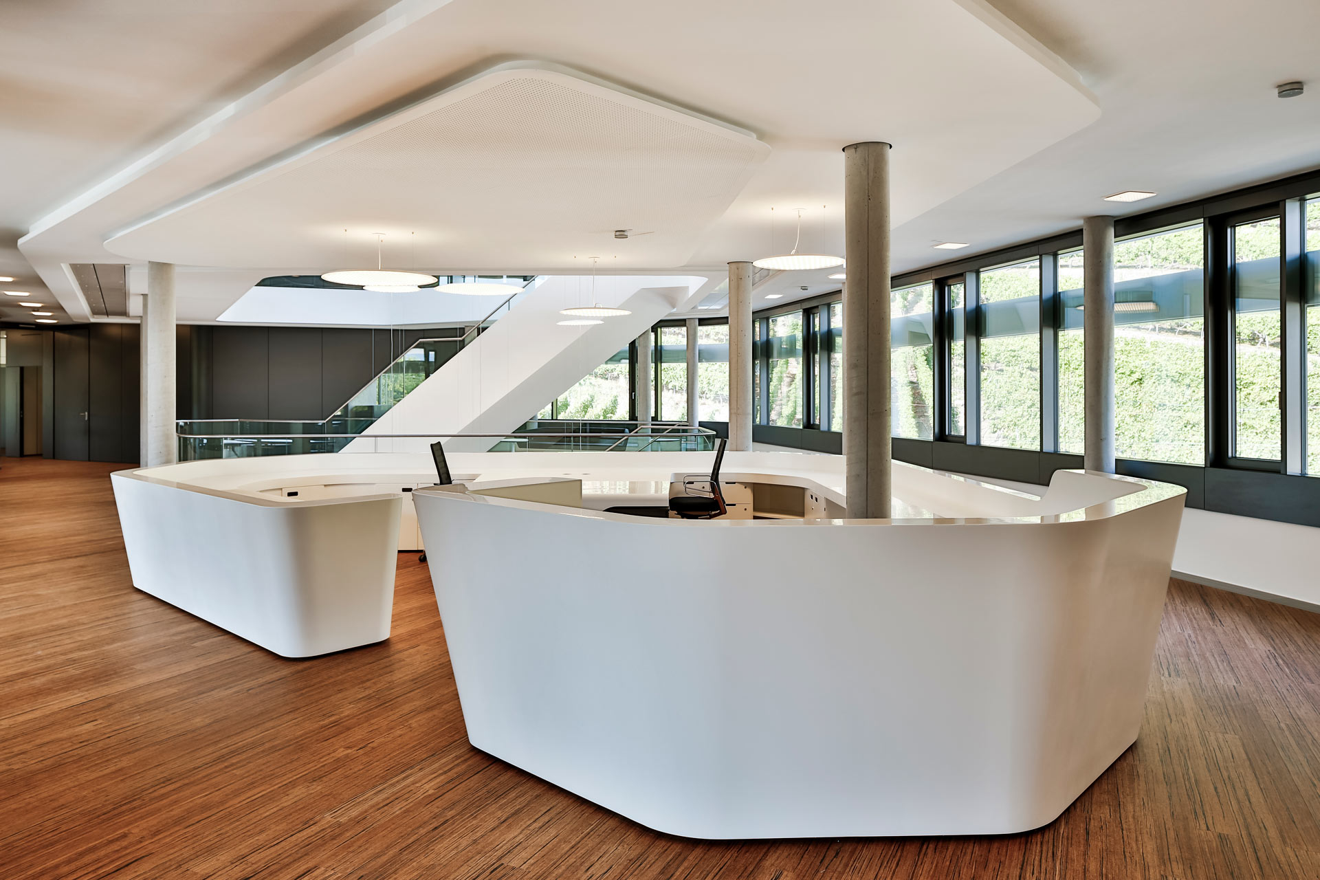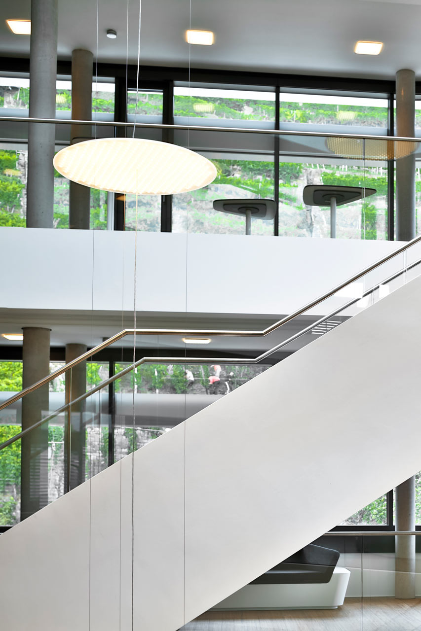 The building consists predominantly of single and double offices arranged along the façade. The auditorium on the ground floor holds 100 people and can be opened and enlarged. A generous atrium connects the ground level with both upper floors. Active slabs systems in the ceiling ensure comfortable work spaces all year round. To reduce noise levels, acoustic absorbers were integrated in the ceiling. However, the function of the ceiling as a thermally activated component with a smooth surface was maintained.