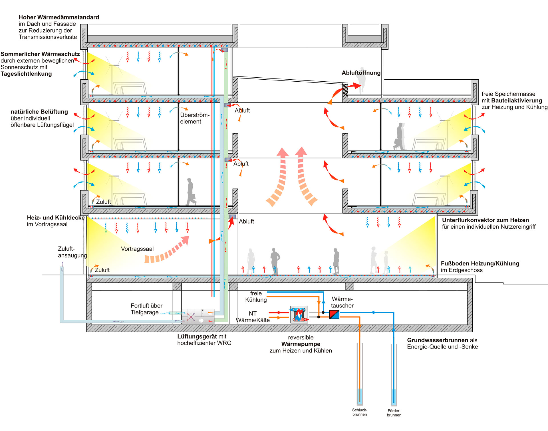 Due to its location, exposed to a railway line and main road, an all-natural ventilation approach using the façade windows would have caused high indoor noise levels. Therefore, a displacement ventilation system introduces fresh air at low velocity into the offices via infloor convectors. The return air transfers from the office to the corridors via air transfer elements integrated in the partition walls and is then exhausted at central locations. The omission of return air ducts saves material and space. Integrated infloor convectors serve as a fast-acting heating system and allow users to control the temperature individually. The air intake for the ventilation system is located at the facade on the ground floor level. After an efficient heat recovery, the exhaust air is used for ventilating the underground parking garage.