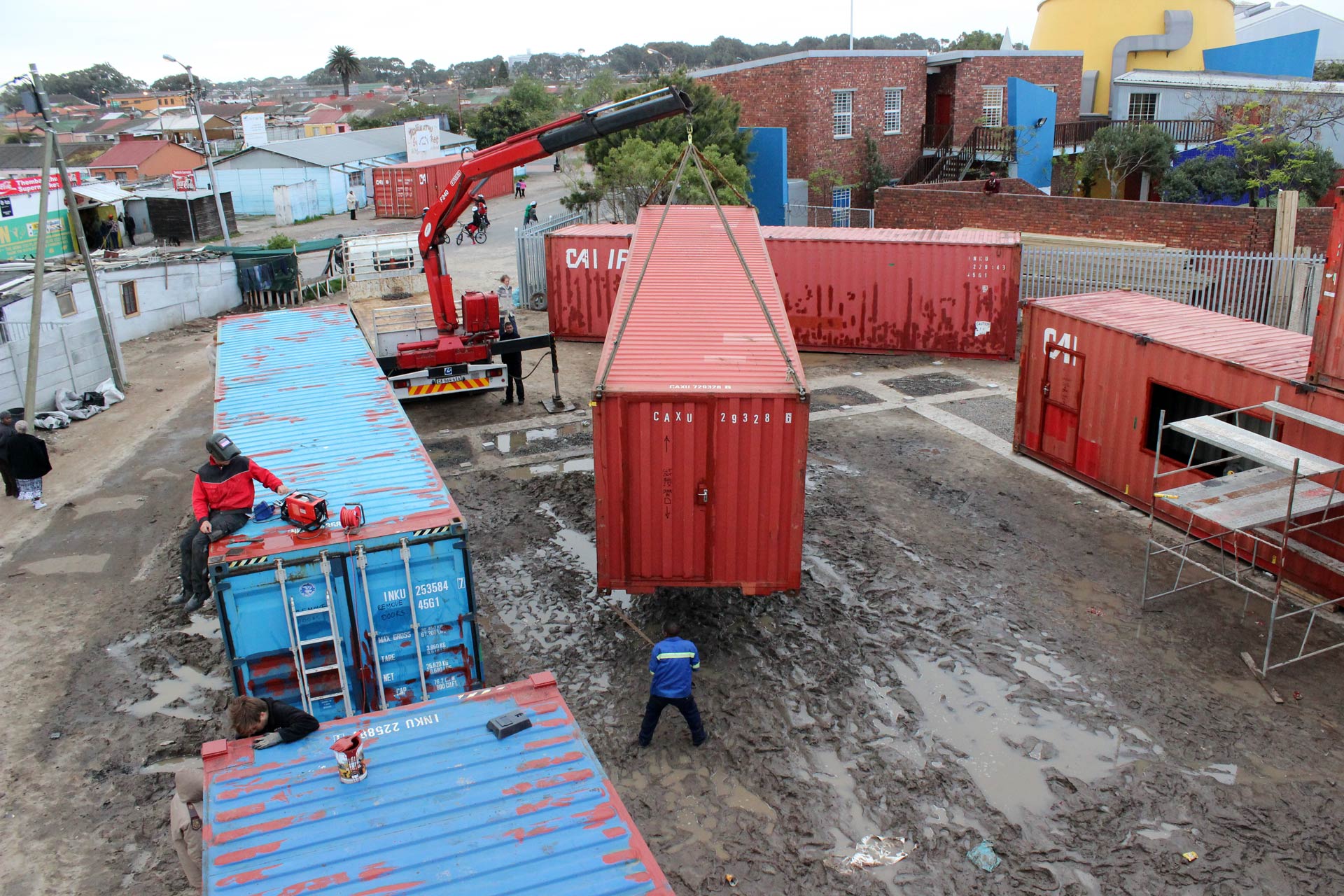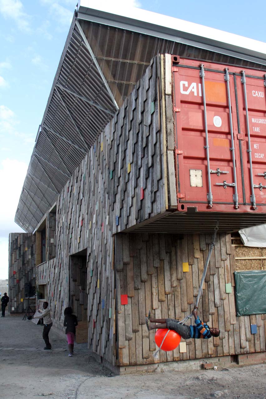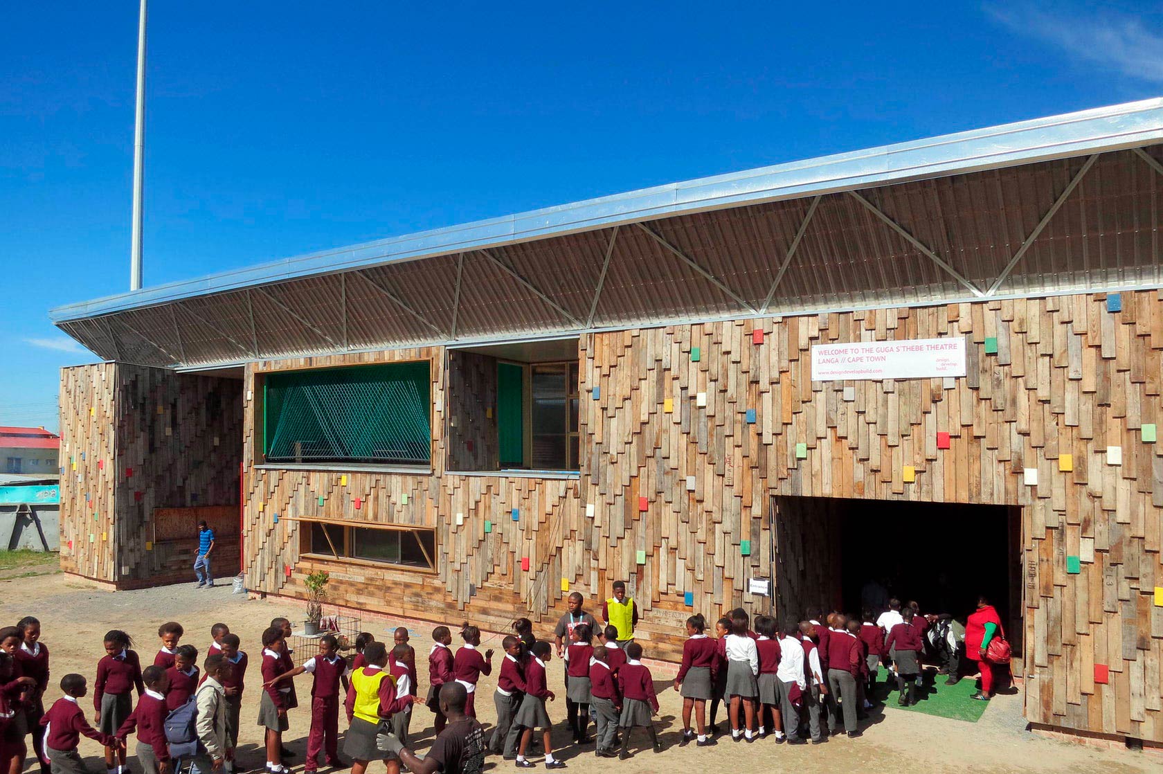 The Art and Culture Center Guga S'Thebe was built in Langa, Cape Town in 2006 as part of an initiative of RWTH Aachen. However, the center lacked a performance and concert space and so the decision was made to build the Guga S'Thebe Children's Theater nearby. Numerous institutions participated in the design, planning, and execution of the project in addition to RWTH including the Peter Behrens School of Arts in Dusseldorf and the Georgia Institute of Technology in Atlanta. The goal was a multifunctional space for up to 200 people and built primarily of local, traditional and recycled materials, including shipping containers, which were available at low cost.