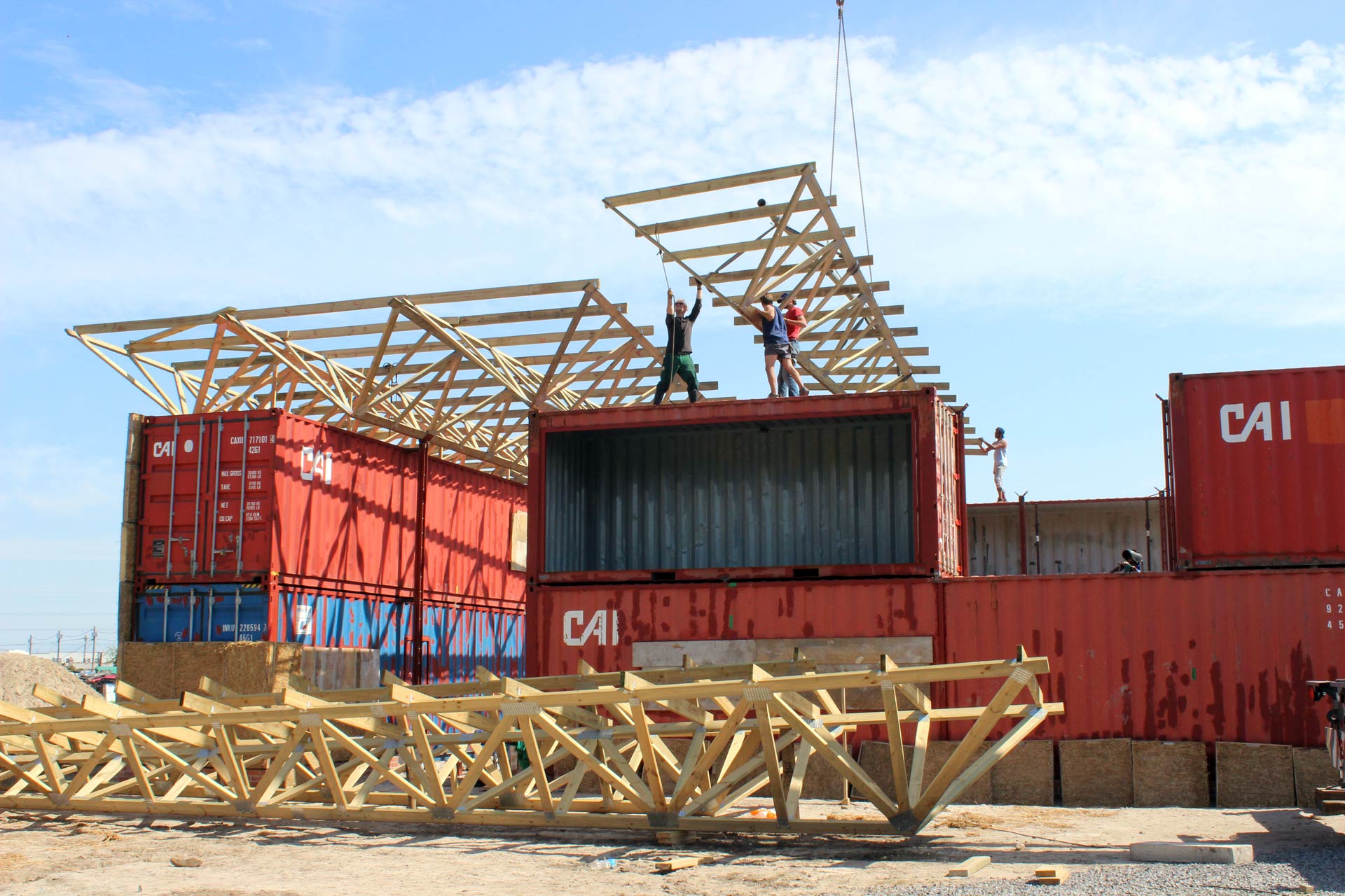 Transsolar developed and contributed pro bono a climate concept based exclusively on passive measures and supported by thermal and daylight simulations. To naturally ventilate the theater and to provide a comfortable climate, flaps for supply and exhaust air were installed in the facade on the ground and first floors. As the sun rises high in the summer, the extended roof provides effective shading. Due to its design, the high roof transfers little heat into the interior and dissipates all absorbed solar radiation to the outside air. The outer walls of the containers were insulated using pre-fabricated 90 x 90 cm modules made of a milled straw-loam mixture. The additional thermal mass dampens temperature fluctuations in both summer and winter and helps to ensure an optimal indoor climate. The outermost façade, consisting of recycled boards from fruit crates is ventilated and protects against the weather.
