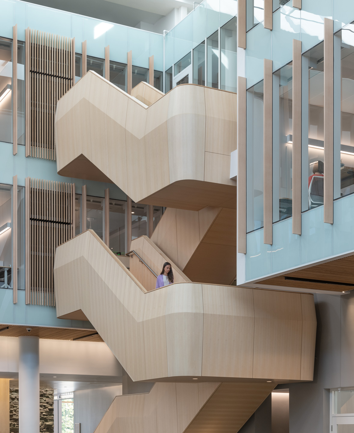 There are operable exterior venetian blinds on all ground floor windows, which require more solar control because they are larger than those in the rest of the building. Fixed shading is provided on the east and west, and carefully calibrated, shaded roof openings provide daylight into the new atrium formed by the meeting of the new Irving Institute building and the existing Murdough building.