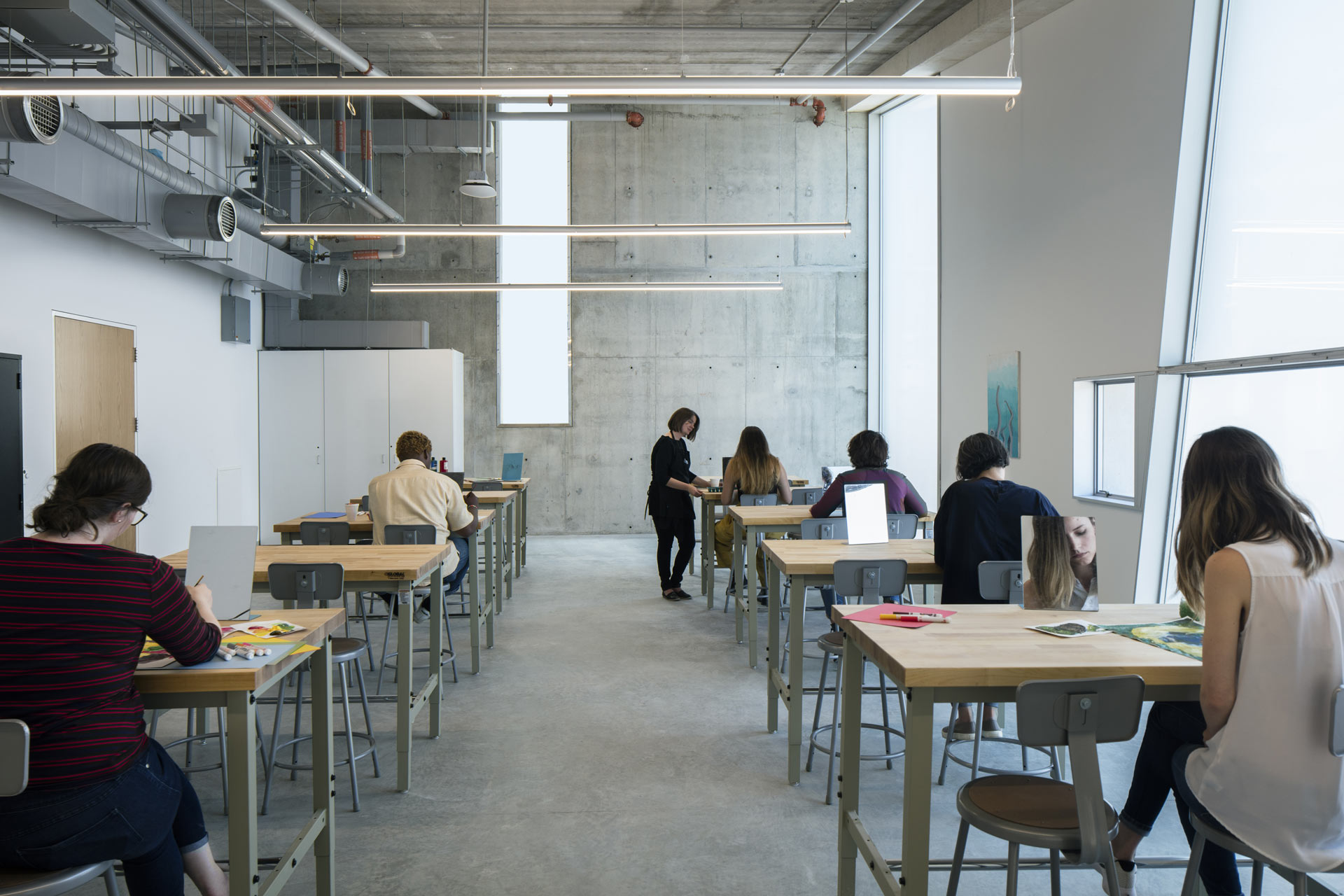 Transsolar supported development and performance optimization of the façade concept. Precast concrete panels create a rhythm across the exterior surface as they alternate with glass panes that provide diffuse natural light to all studios and classrooms with tall ceilings.
