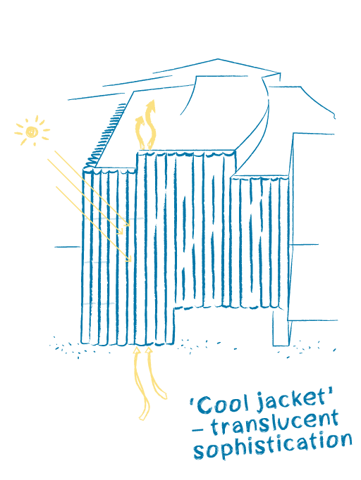 Steven Holl and Matthias Schuler developed the idea of a secondary skin composed of frosted glass-tubes at the very beginning of design. The curved glass provides both uniform daylight for the windows in the inner facade and in addition acts as a ‘cool jacket’ by reducing the amount of solar heat gain into the building - critical for Houston’s sunny climate as well for the opaque wall elements. Visible and invisible solar radiation is captured by the outer glass layer and vented to outdoors via the top openings of the half-tubes. Different thermal studies quantified the ‘cooling’ effect: the ‘cool jacket’ assembly reduces the heat gain and cooling load for a gallery space by 35% compared to a building envelop following code requirements. The spectral properties of this complex façade buildup were evaluated and optimized in an iterative process considering aesthetics, cooling performance, daylight, and constructability.