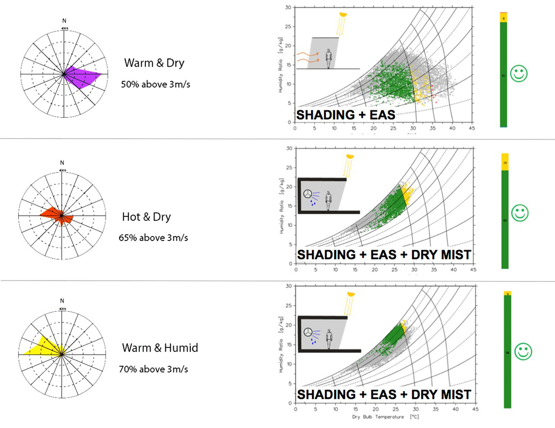 Designed to take advantage of prevailing winds, breeze cools the courtyard, additional fans further increase the air speed when necessary. Shading is provided by structures including a light weight membrane roof as well as plant growth. Air temperature is tempered through evaporative cooling with water features and as necessary dry mist systems. And thermal mass stores coolness from lower night time temperatures to give of throughout the course of the day.