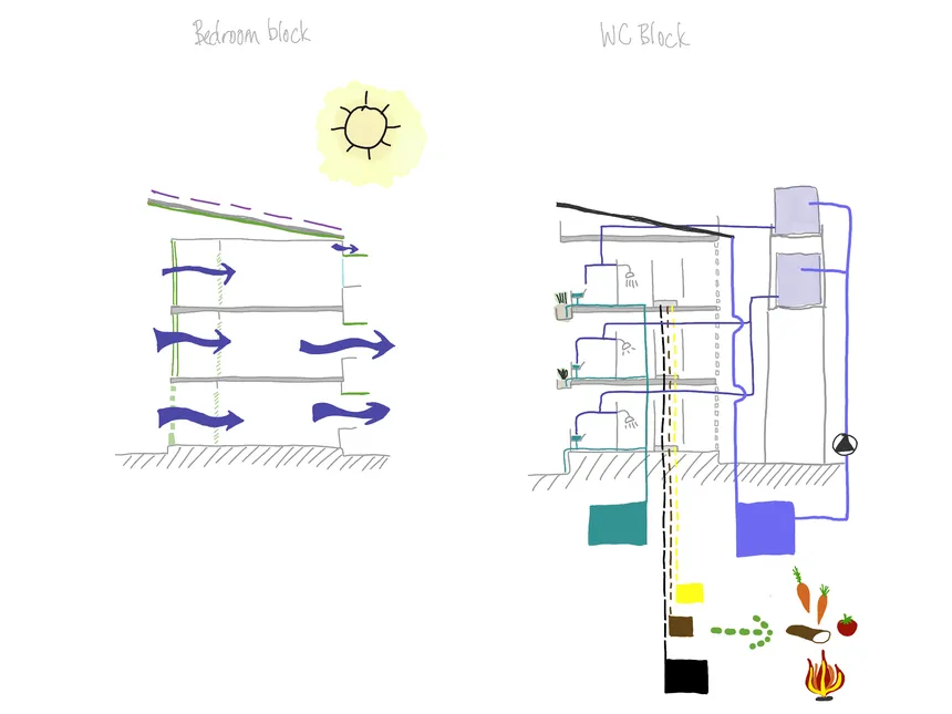 As the builder, Impact Building Solutions brings an innovative building material to the project, the Zero Carbon Panel. The panel material has a high-density core made of rice straw, is manufactured without resins and is wrapped in recycled cardboard. It helps keep the building's carbon footprint low. Transsolar Academy 7 Fellows as a team also came up with some possible eco-friendly solutions as options: ventilation via solar chimneys, rainwater harvesting, solar thermal systems, and the extraction and utilization of biogas. Given the limited construction and operational budget, costs were examined along the way and measures, like reduced electrical outlets, were included in the design.