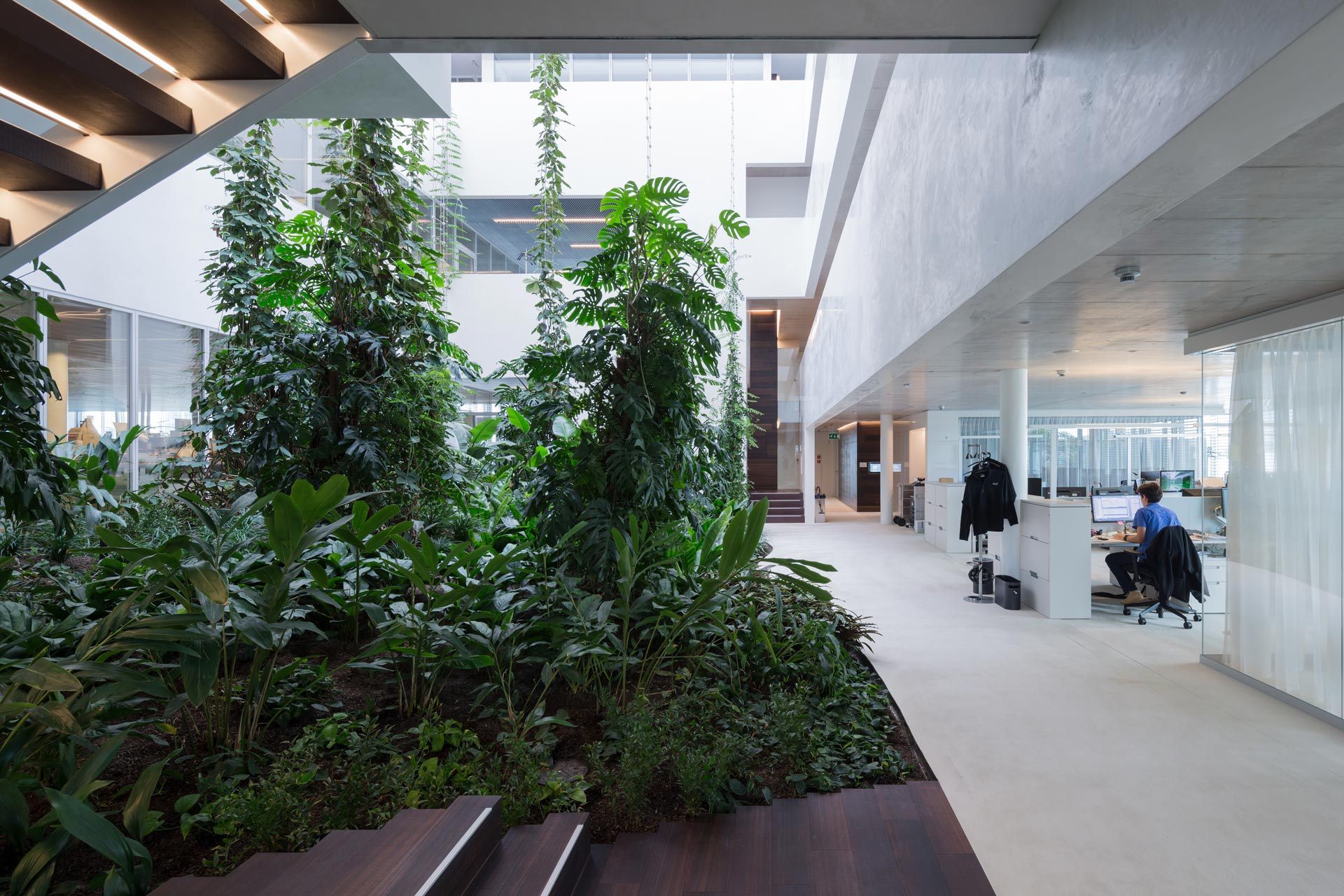 The symbiosis of open-plan laboratories and open-space offices makes two green atriums possible: one is located on top of the other. On the one hand, they create informal communication spaces with visual contact and, on the other hand, they combine the different room heights of the laboratory and office in a compact cube.