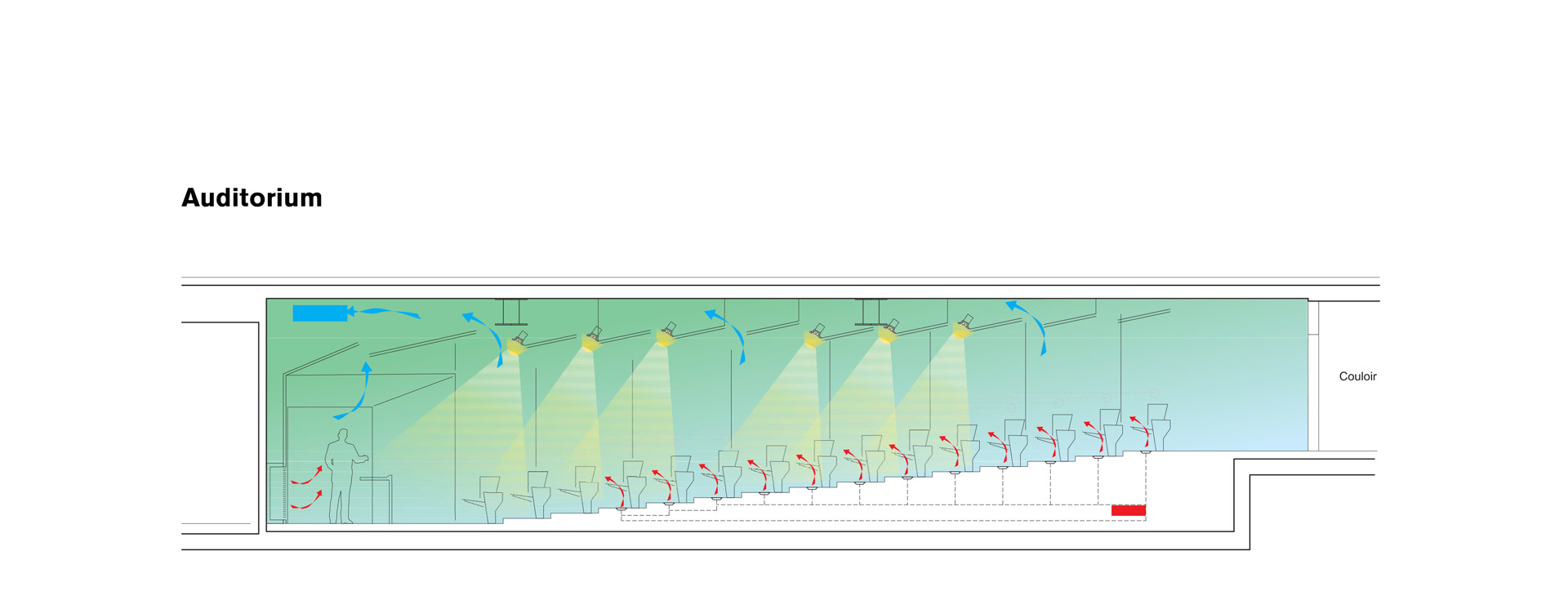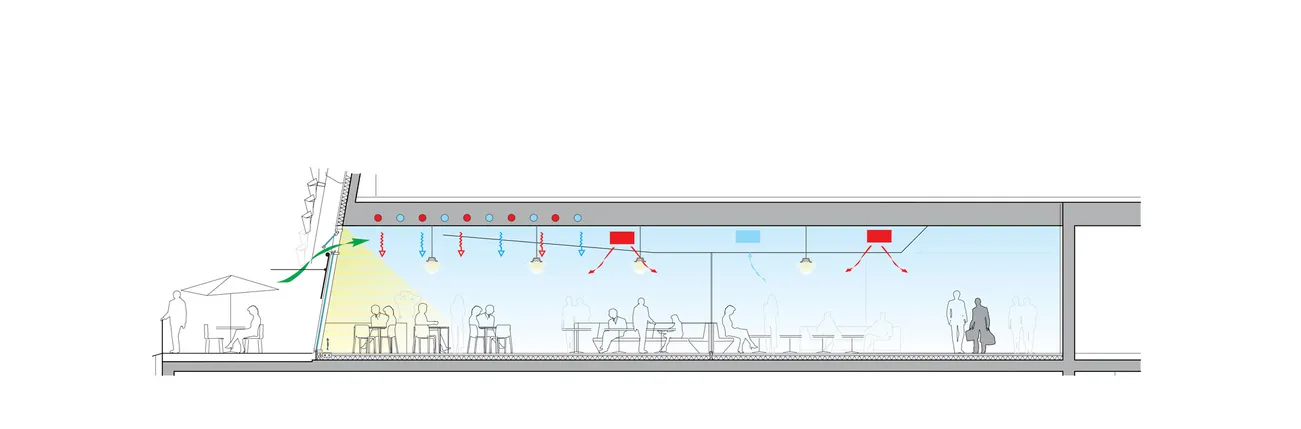 The component activation allows mainly a low-temperature heating and high-temperature cooling. The hybrid ventilation in all non-laboratory rooms with connection to the facade reduces the need for mechanical ventilation in these areas. In the labs, mechanical ventilation is minimized to the hygienic requirements of fresh air and controlled by usage sensors. A reversible heat pump system allows synergistic heat recovery from the laboratories to the non-laboratory rooms.