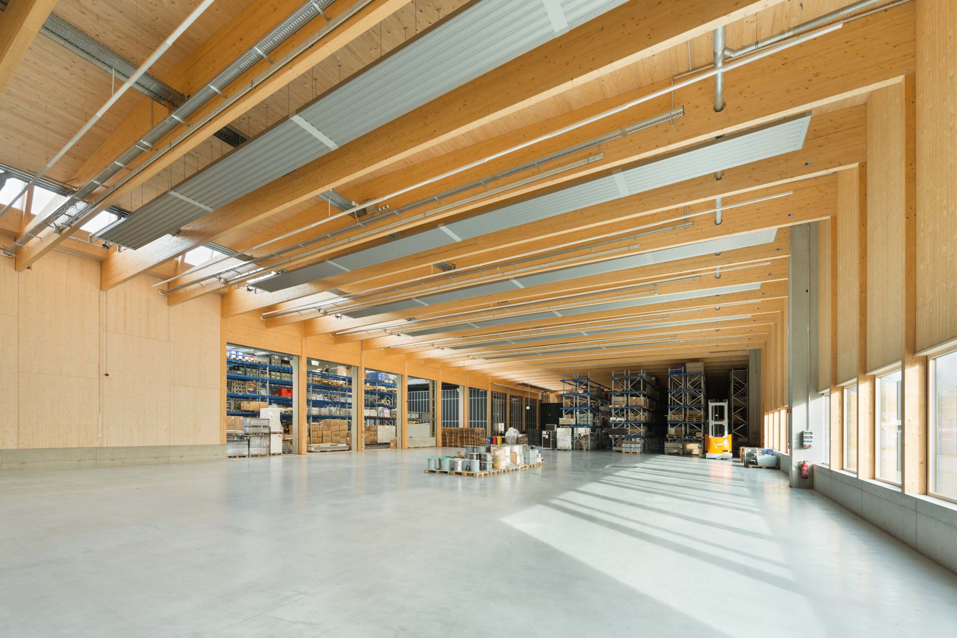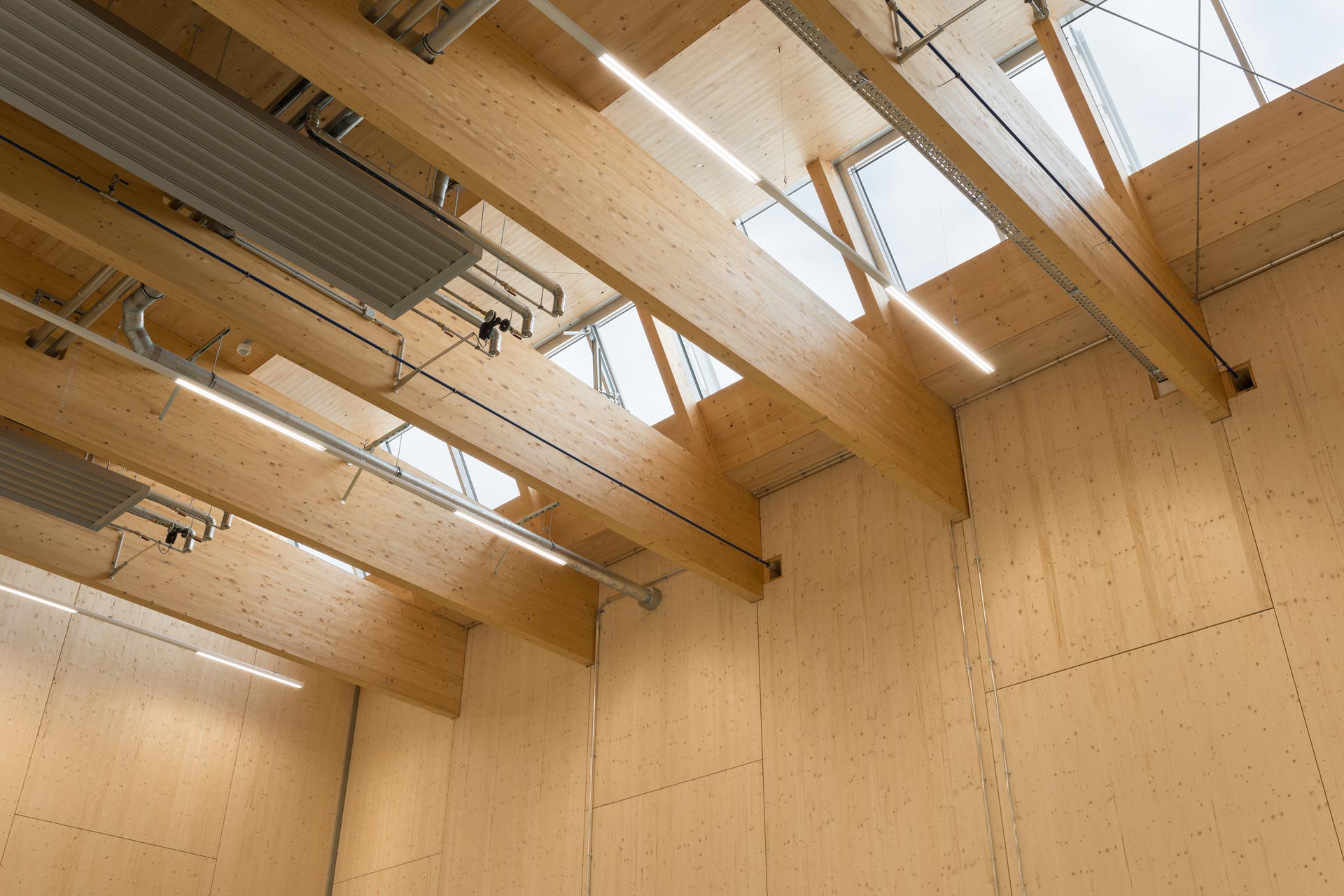 A dynamic thermal building simulation was performed to identify the optimal insulation thickness and appropriate heating and cooling systems. A mechanical ventilation system is no longer needed due to deliberately positioned windows and skylights with time-controlled night ventilation. North-oriented glazing in the shed roof and adjustable shading in the offices and hall enable an optimized use of daylight and minimize the energy demand for artificial lighting. Efficient LED lighting is used throughout the building and is dimmed when possible.