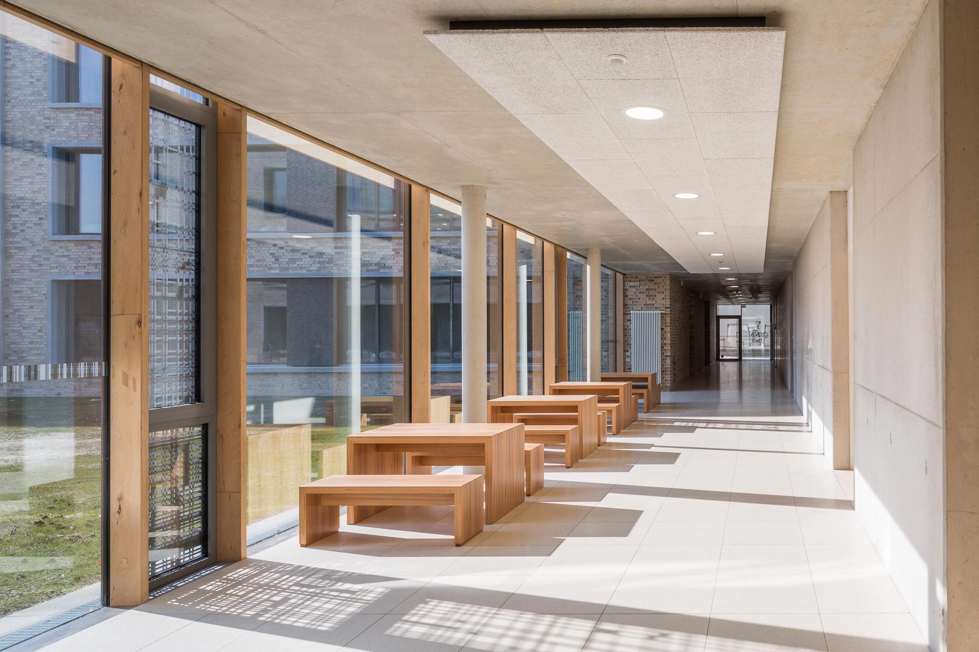 The lighting concept is energy-conscious as well: Intensive studies on daylight values in advance characterized the planning. With presence detectors and daylight-dependent controls as well as large windows with low parapets, supplemented by skylights and LEDs for sufficient lighting, the solution for building operation is optimal. Cost-effective lightweight panels made of excelsior are used as ceiling sails in the classrooms to ensure good acoustics. They require less space than, for example, gypsum plasterboard and thus allow more thermal storage mass to remain due to non-suspended ceiling areas.