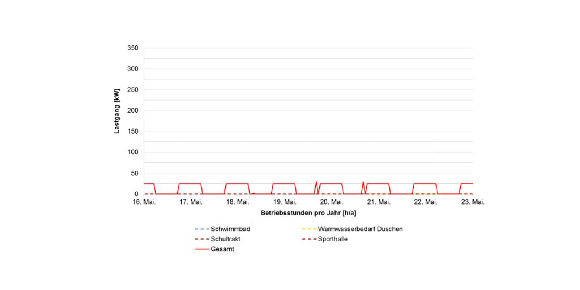 Lastgang des Wärmebedarfs einer Sommerwoche aufgelöst auf die Bereiche Sporthalle, Schulgebäude und Schwimmhalle