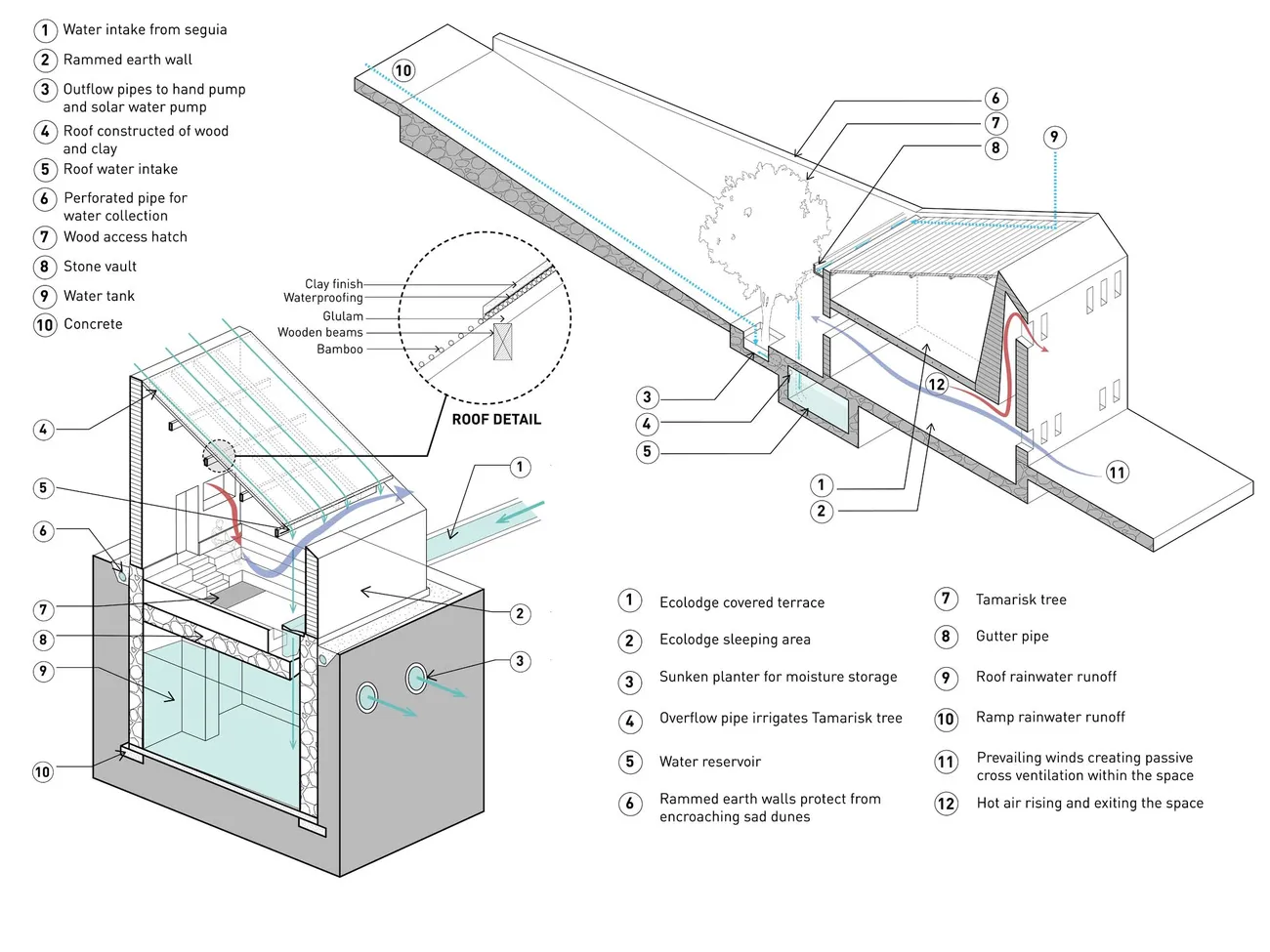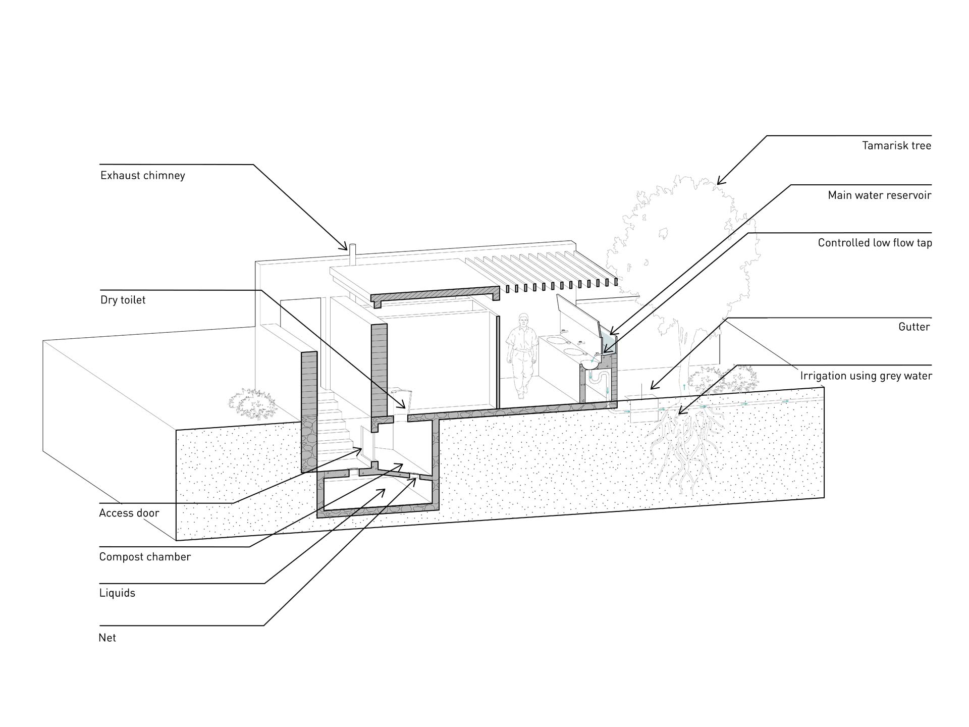 Facilities such as compost toilets streamline waste output and minimize environmental footprint. The use of natural building materials including rammed earth, palm tree trunks, and arish (thatched palm leaves) nearly eliminates CO2 emissions from the life cycle of these structures, with the exception of concrete which is sparring used in the water reservoir.