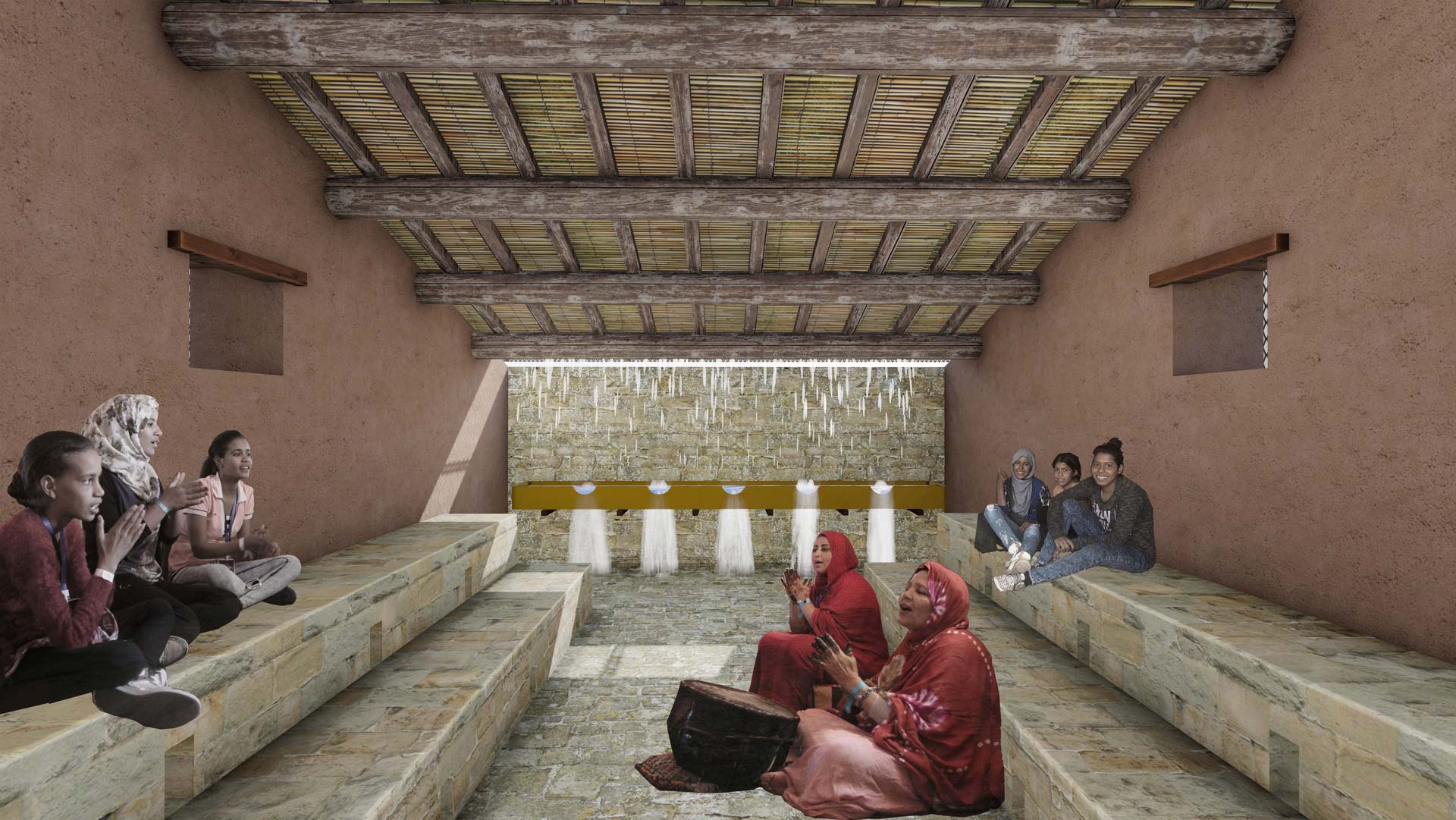 Due to the off-grid nature of the site and the efficacy of solar panels in our sunny region, the centre will be completely reliant upon photovoltaic solar panels for its energy consumption. The thermal mass of buildings with 80 cm rammed earth walls volumes provides passive thermal control by absorbing heat during daylight hours (cooling) and releasing it at night (heating). Temperature can drop significantly in the desert, nearing 1oC in the month of January. Windows, placed facing each other to promote cross-ventilation, are placed strategically to limit solar gain and are kept small, not exceeding 30 cm in width and are equipped with wood shutters with louvers, which can be modulated depending on the season and time of day. Further to the shutters, windows have mosquito nests. From May until September when night temperatures are high (25 - 28oC), the louvers of the shutters and the doors of all buildings will be left opened at night to allow for the flushing of the heat released by the rammed earth walls. Solar gain from the roof is limited by the use of a traditional roof composed of a 10-12 cm layer of clay and hay and 5 layers of woven reeds. Mechanical systems are kept to a minimum, with buildings relying on solar panels for energy, a solar-powered water pump for water distribution and 5 solar powered air extractors for the classrooms (one each) and the recording studio (2). Classrooms employ a passive cooling system which consists of solar chimneys combined with a double ceiling and a Canadian well system which supplements natural ventilation with cooled air.