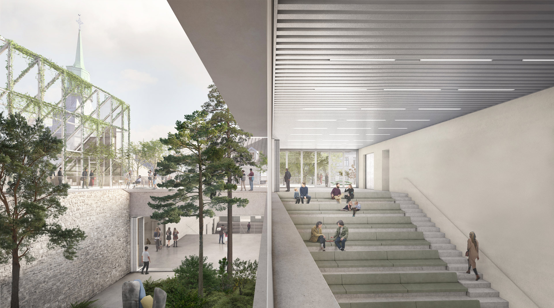 In 2021, PHI launched an International Architecture Competition for the design of PHI Contemporary. Transsolar was part of the winning design, led by architect firms Kuehn Malvezzi and Pelletier de Fontenay. Together with the design team, Transsolar established the appropriate climate conditions for each key part of the building based on programmatic needs. The central public forum offers a "mid-door" experience—an intermediary space between indoors and outdoors—providing a tempered transition between the extremes of Montreal’s climate, from very cold winters to warm and humid summer days. This space is tempered by radiant floors. To preserve the existing historical exterior walls, interior hemp insulation is applied as a low embodied carbon material. This breathable wall system helps regulate temperature and humidity peaks naturally, supporting the overall mechanical strategy not only for conditioning but also for ventilation and dehumidification. When outdoor conditions are favorable, the public forum opens via a series of folding doors, seamlessly connecting the main street with the internal public courtyard. Most new Class A art galleries are located underground to minimize energy losses in winter, except for those in the above-ground mass timber addition. This volume is highly insulated and predominantly opaque, featuring a toothed roof with north-facing high-performance skylights that provide diffuse daylight to the galleries below. The remaining program space is dedicated to administrative functions and will be renovated with high-performance operable windows, allowing for extended periods of natural ventilation when outdoor conditions permit.