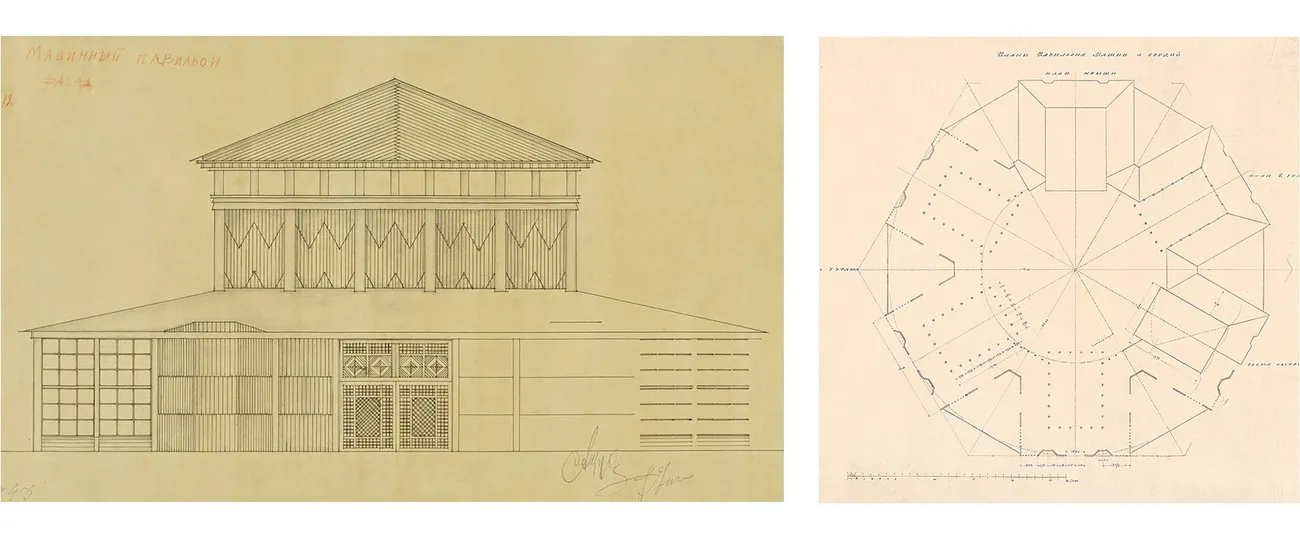 right: Ivan Zholtovsky, Design for the Machines and Tools Pavilion. Plan, 1923