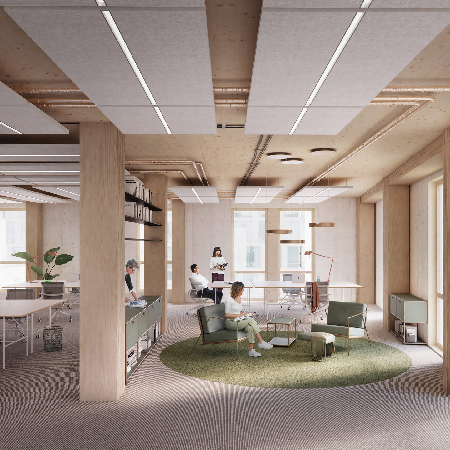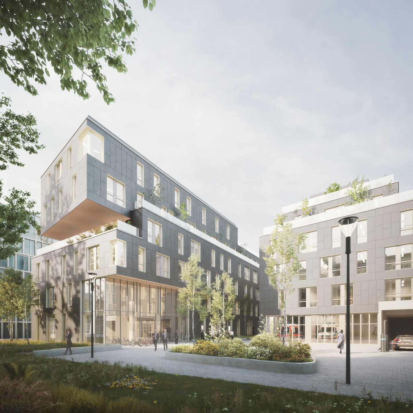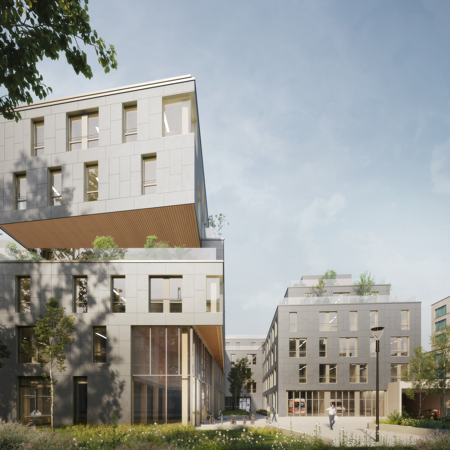 The wood hybrid building method stands for low CO2 emissions of the construction. The ceilings are high, the rooms have optimized large window openings, and an additional sophisticated ventilation concept for basic ventilation. User comfort and system design are tested and optimized via thermal simulations. Efficient sails with acoustic function provide comfort through radiant heating/cooling.