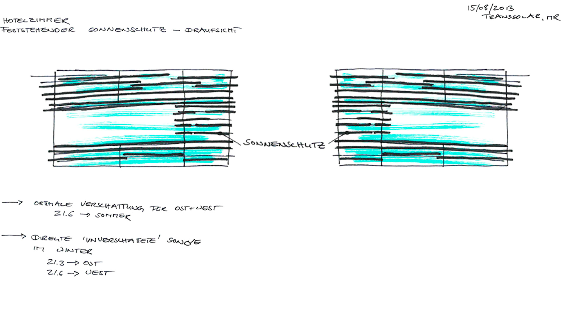 A challenge of the project was to maintain an unobstructed view of the lake while limiting the solar heat gains in summer. The hotel room balconies and the exterior suspended wooden lamella were optimized for sun protection, daylight and views. Motorized awnings are installed on the ground floor to provide shade for the patio, lobby, restaurant and event rooms while allowing for unobstructed views and free passage.